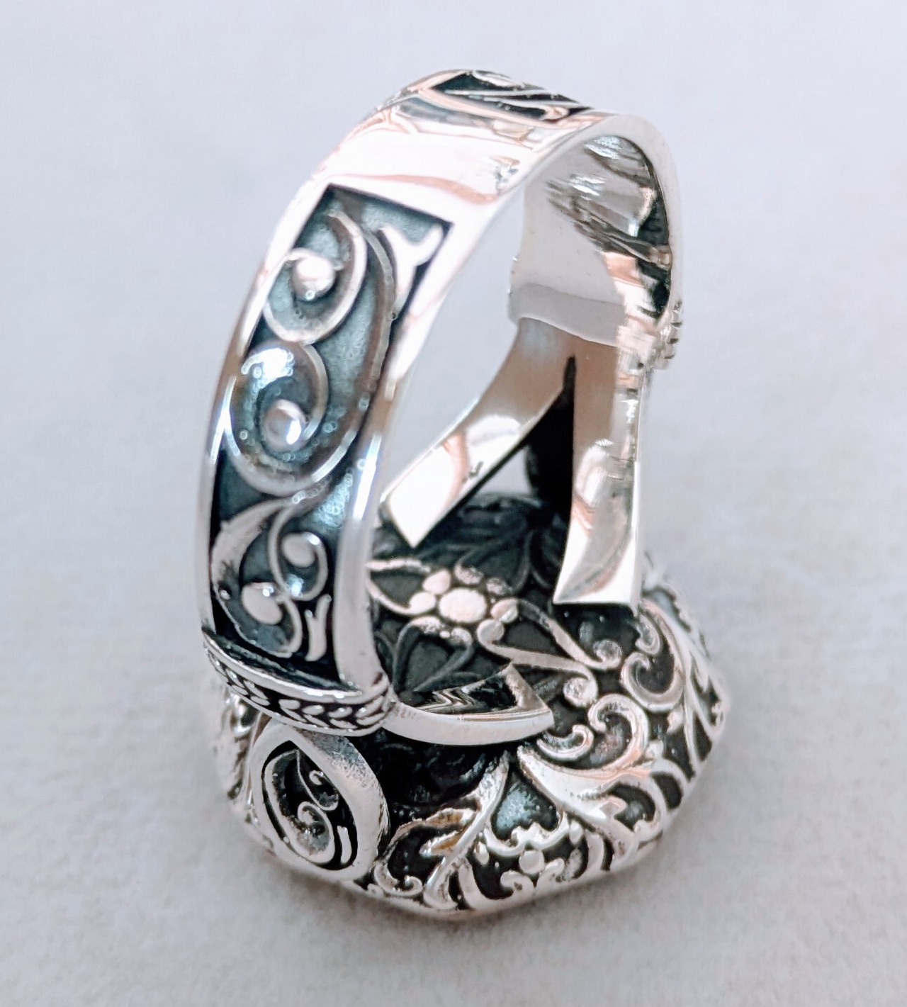 トップ部分はトルコ国旗の『月&星』、土台の裏側と側面にはルーミと呼ばれる「植物で永遠をあらわす」モチーフを施したリングです。