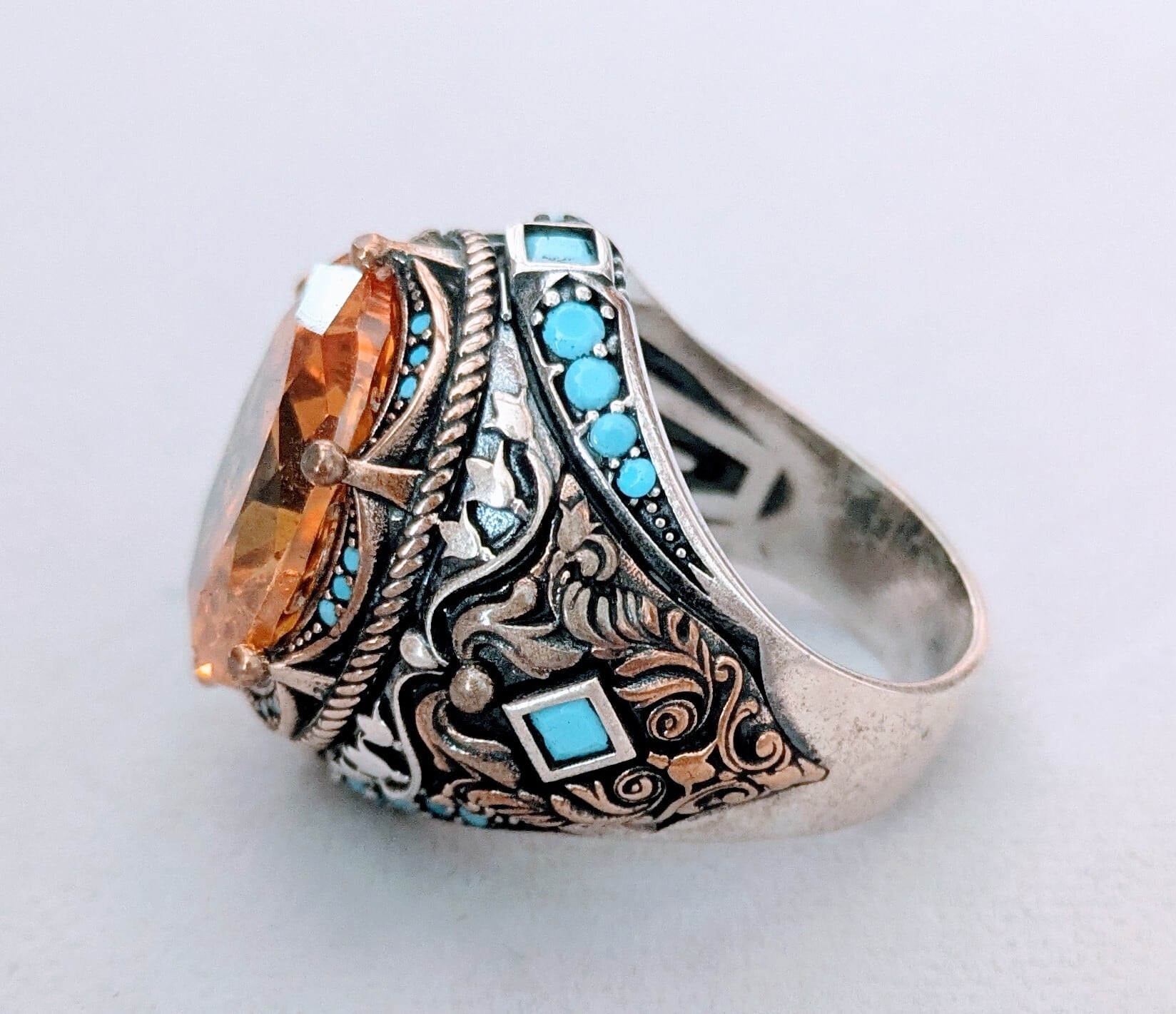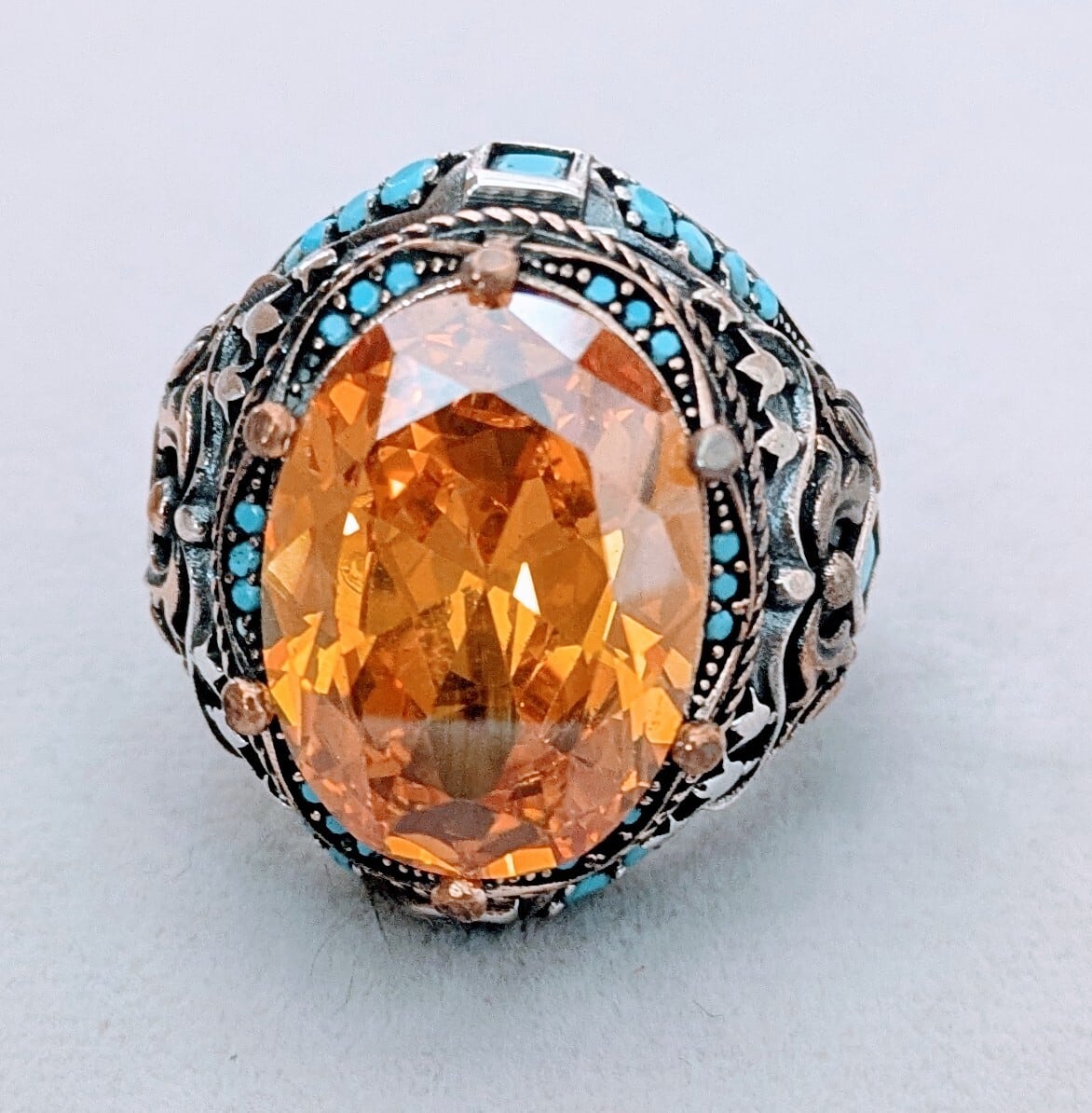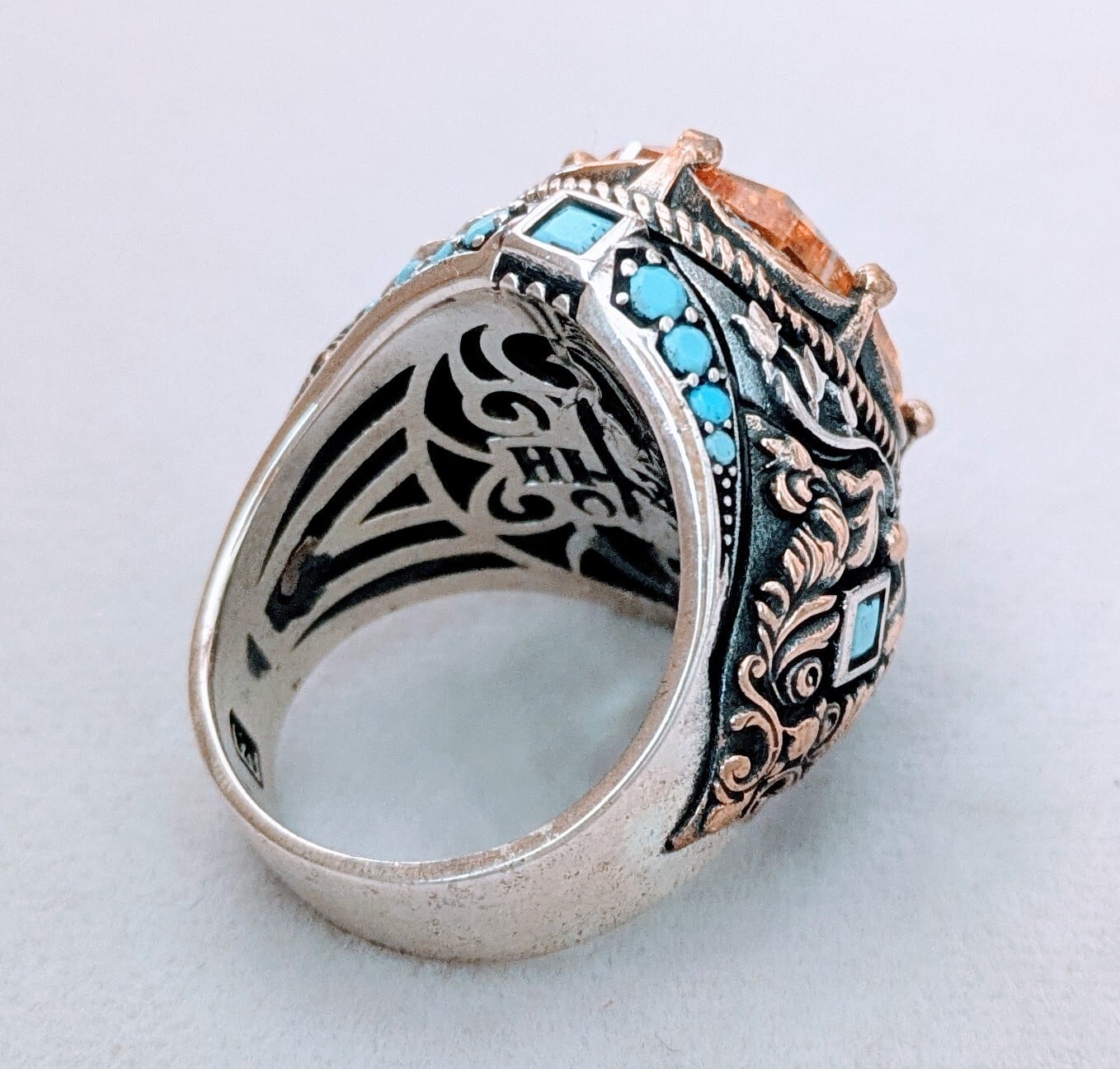 大きなシトリンとターコイズブルーのジルコニアが清々しく、側面のチューリップとルーミーがとてもトルコらしい素敵なボリュームリングとなっています。