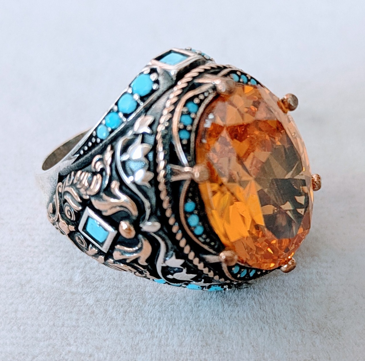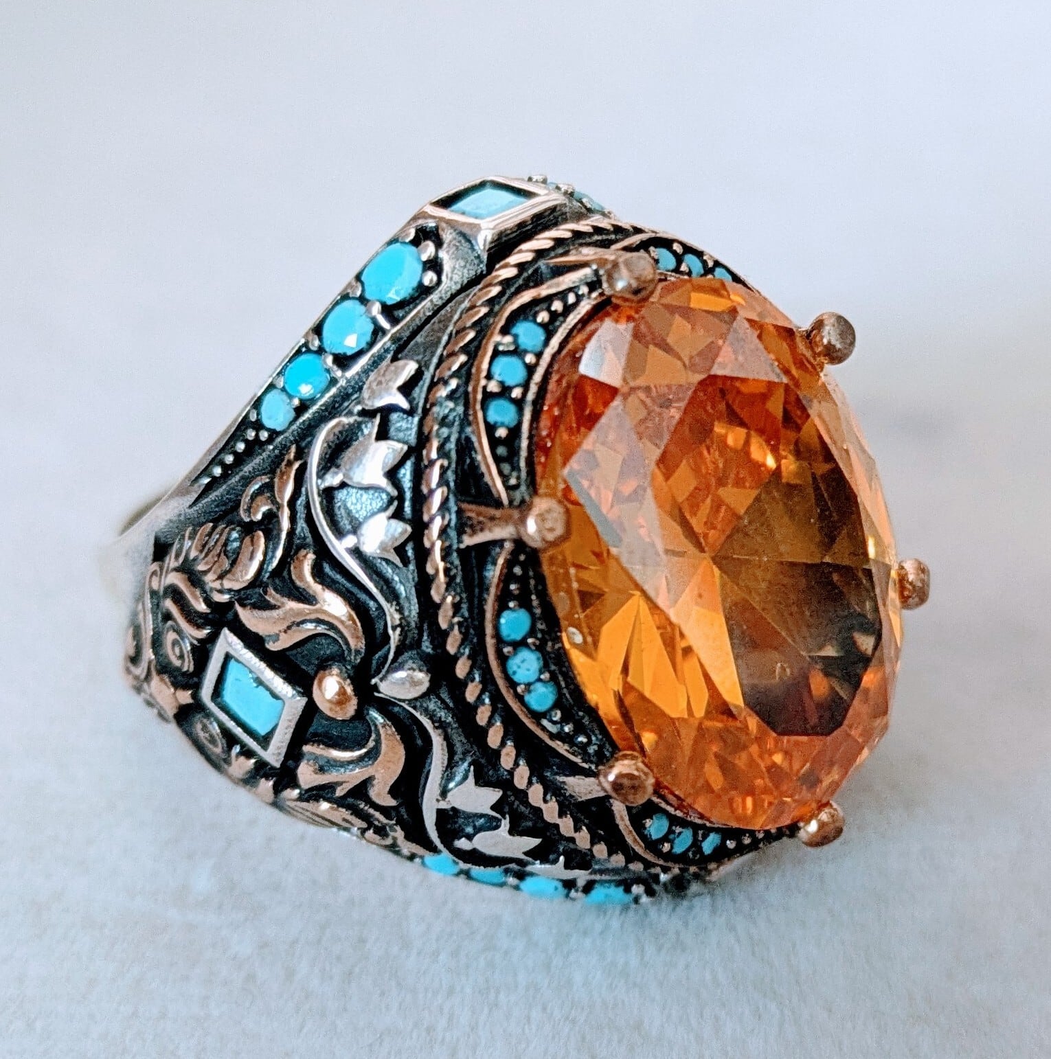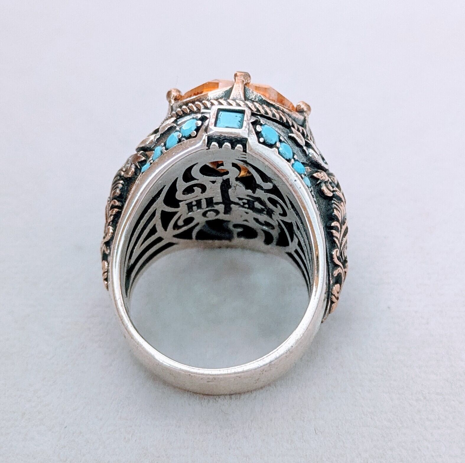 大きなシトリンとターコイズブルーのジルコニアが清々しく、側面のチューリップとルーミーがとてもトルコらしい素敵なボリュームリングとなっています。