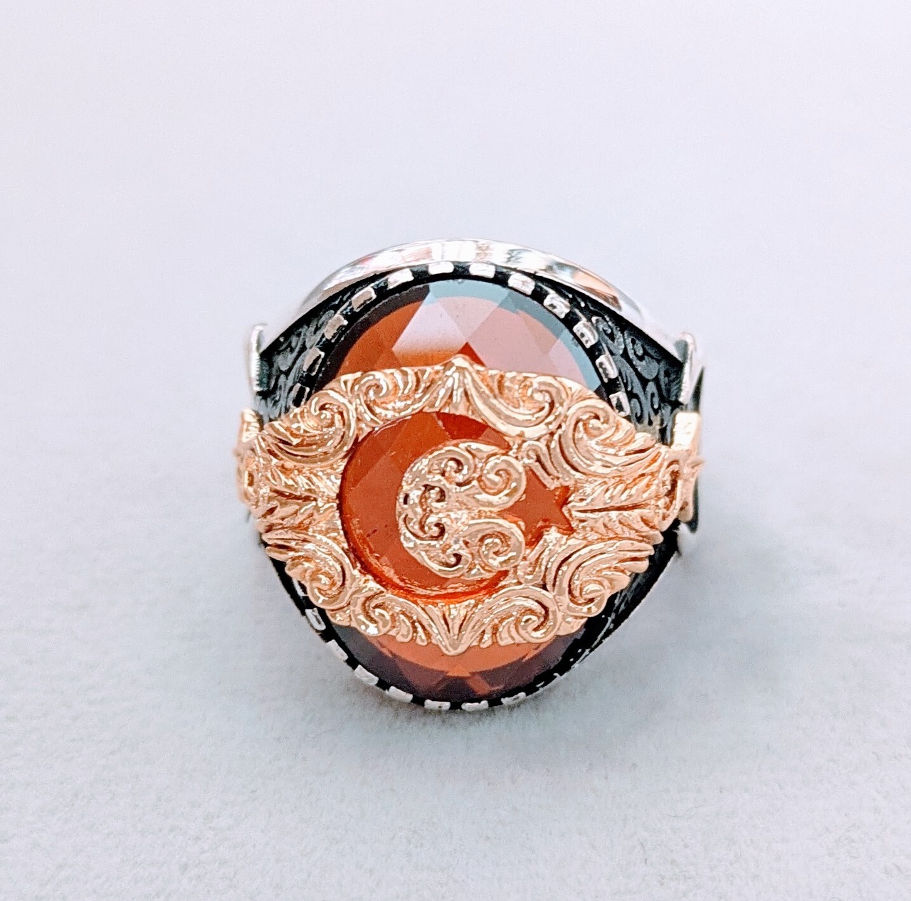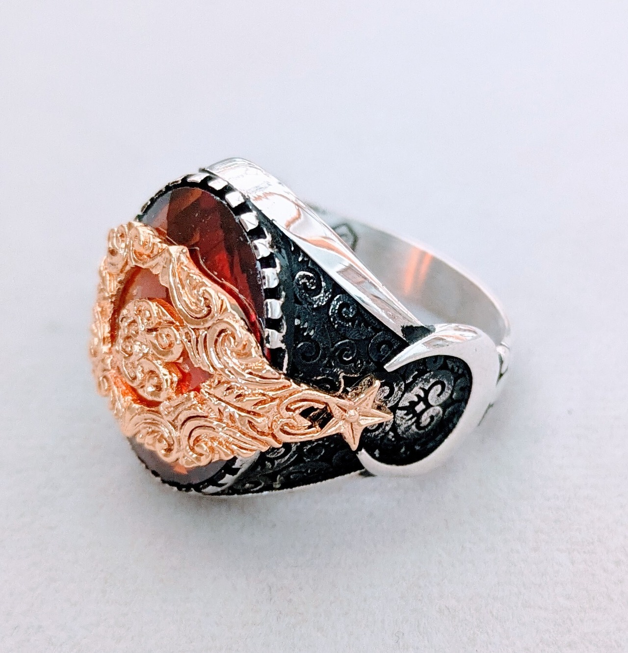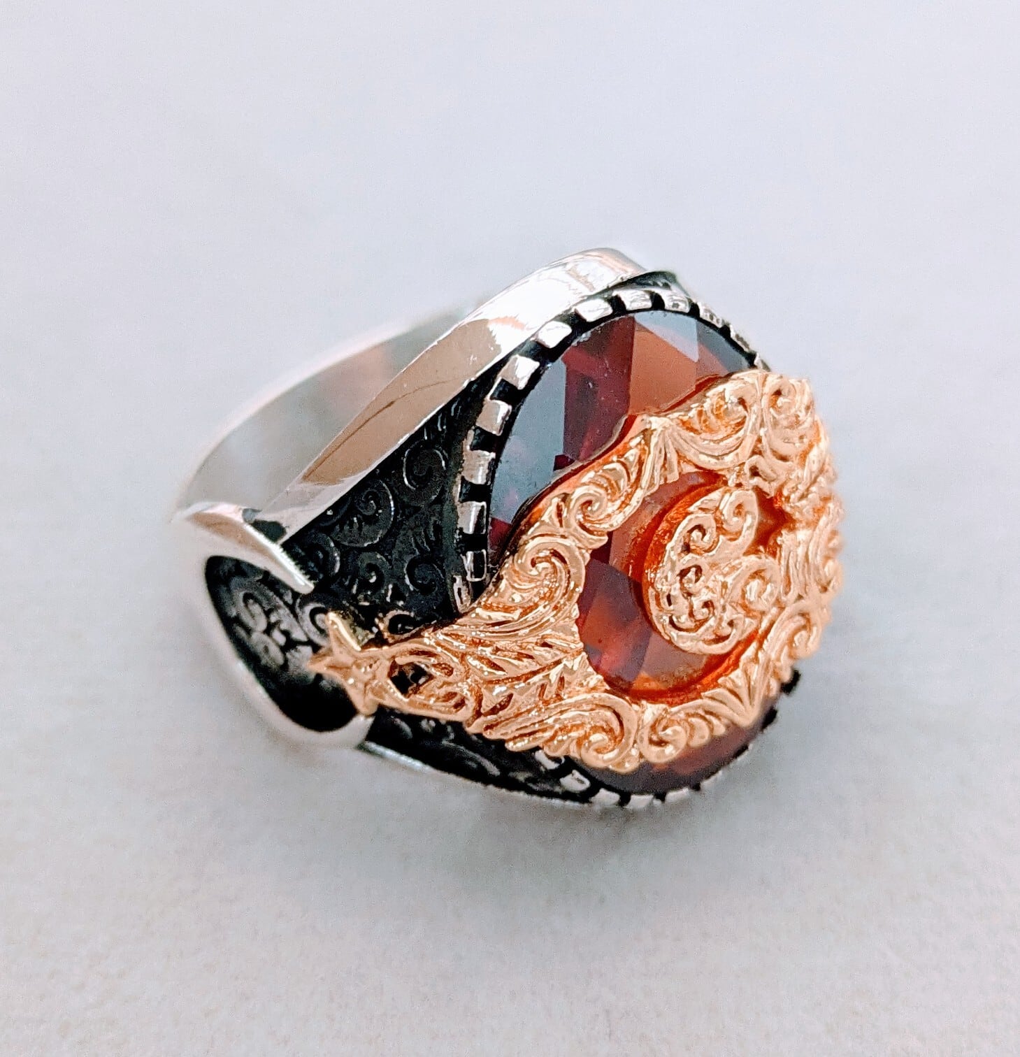 トップ部分には大粒の赤いジルコニア、それを覆うように金メッキで作られたトルコ国旗(月&星)を配置し、両脇部分にも月と星が施されているという、大変凝った作りのリングになっています。