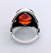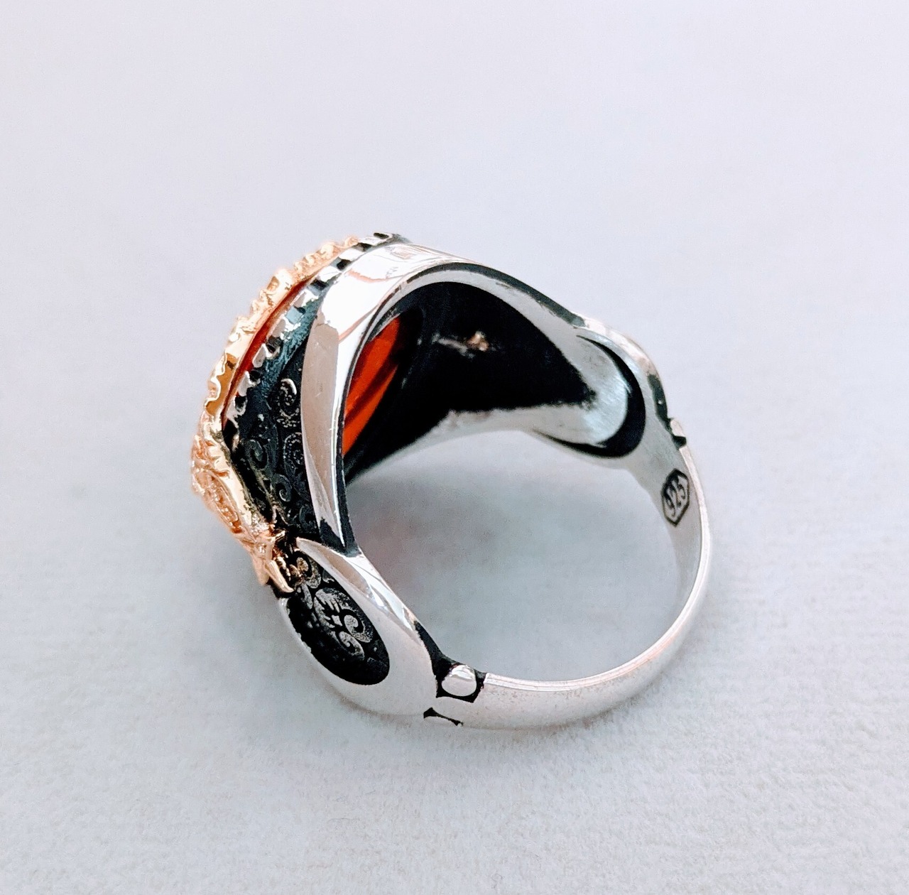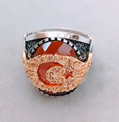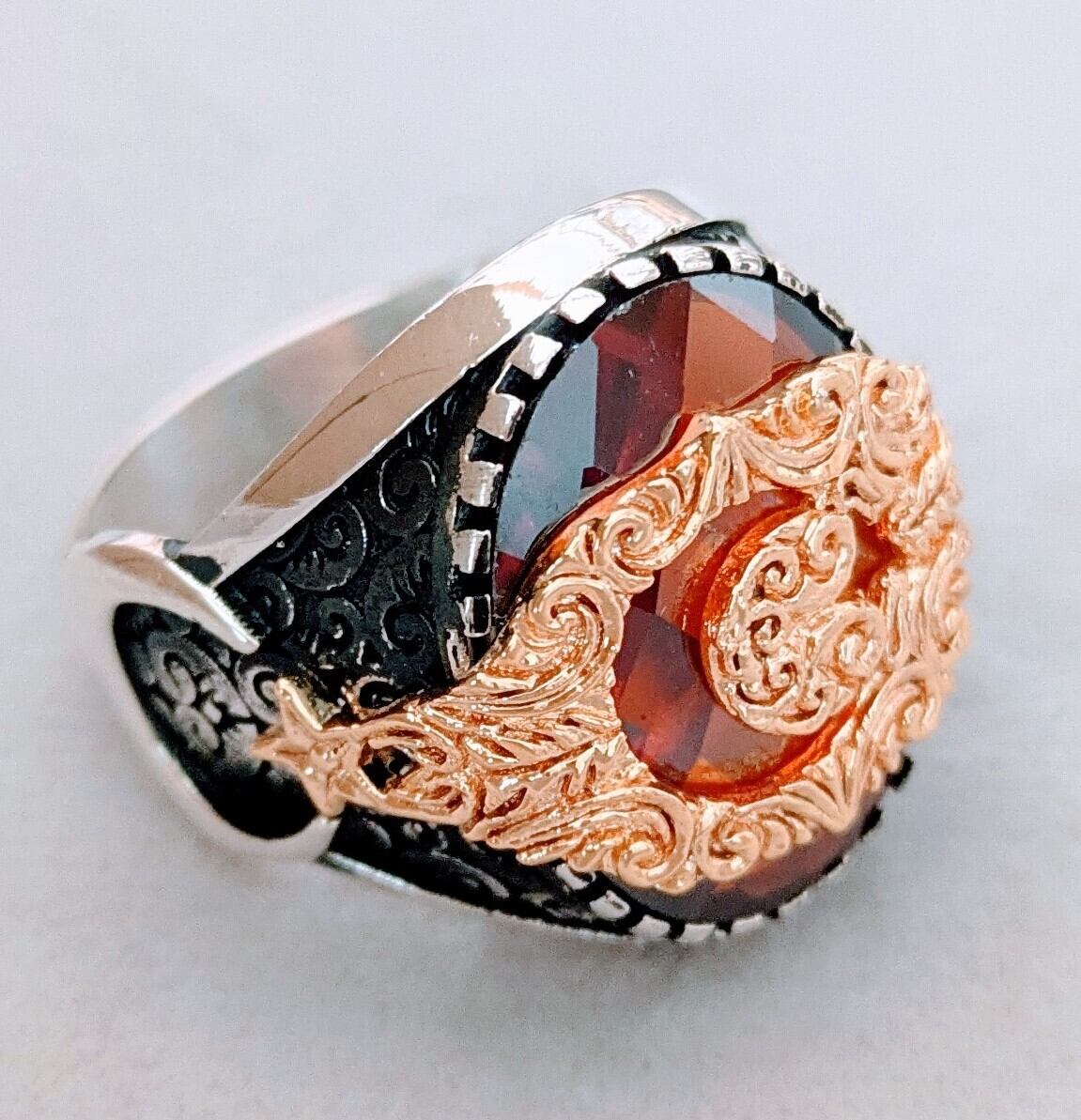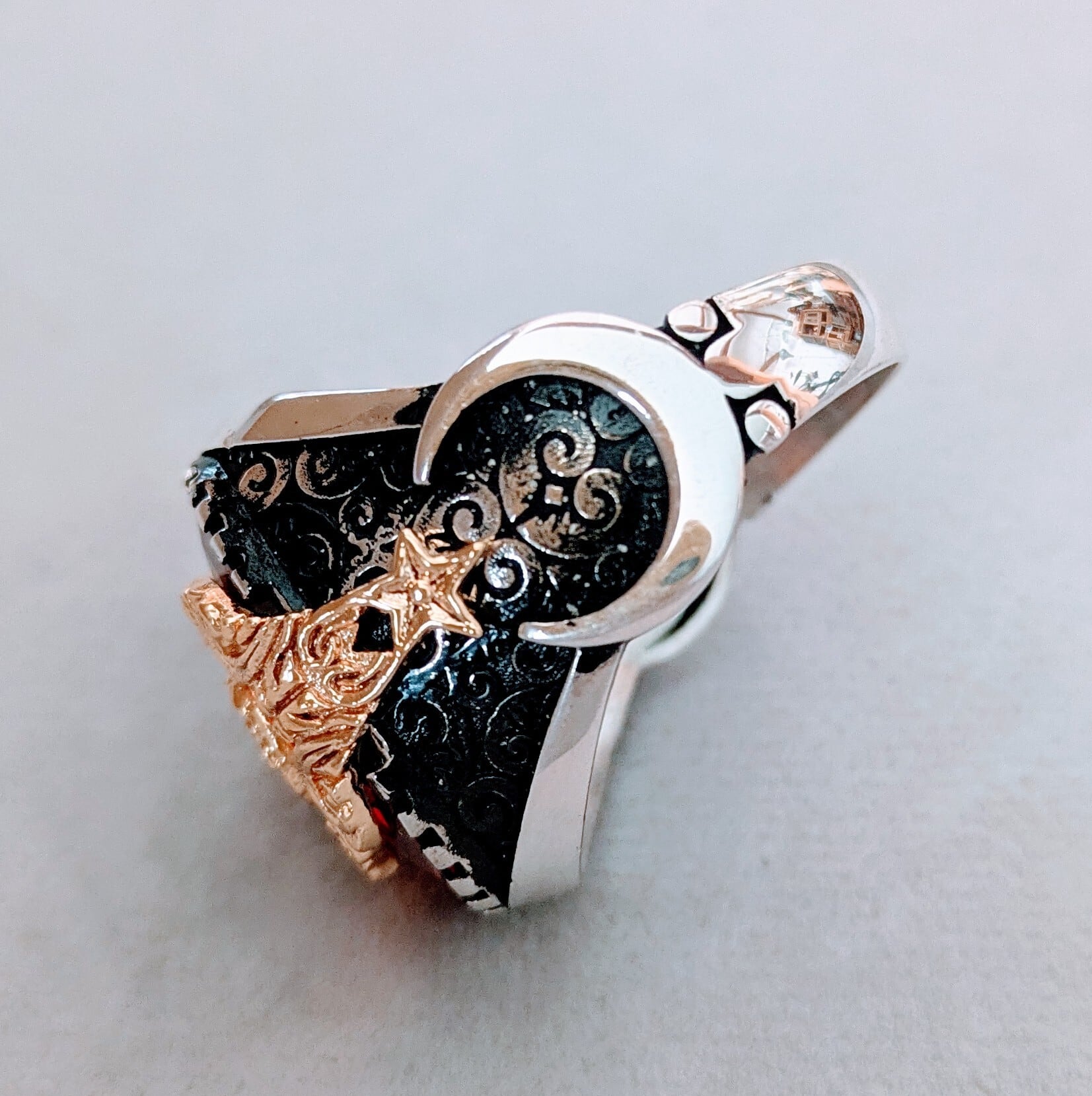 トップ部分には大粒の赤いジルコニア、それを覆うように金メッキで作られたトルコ国旗(月&星)を配置し、両脇部分にも月と星が施されているという、大変凝った作りのリングになっています。