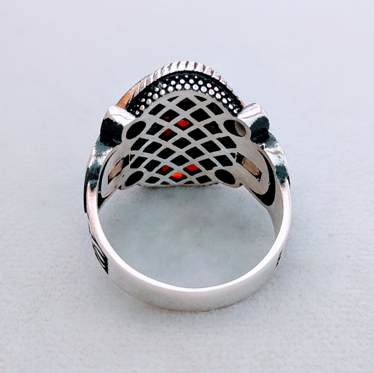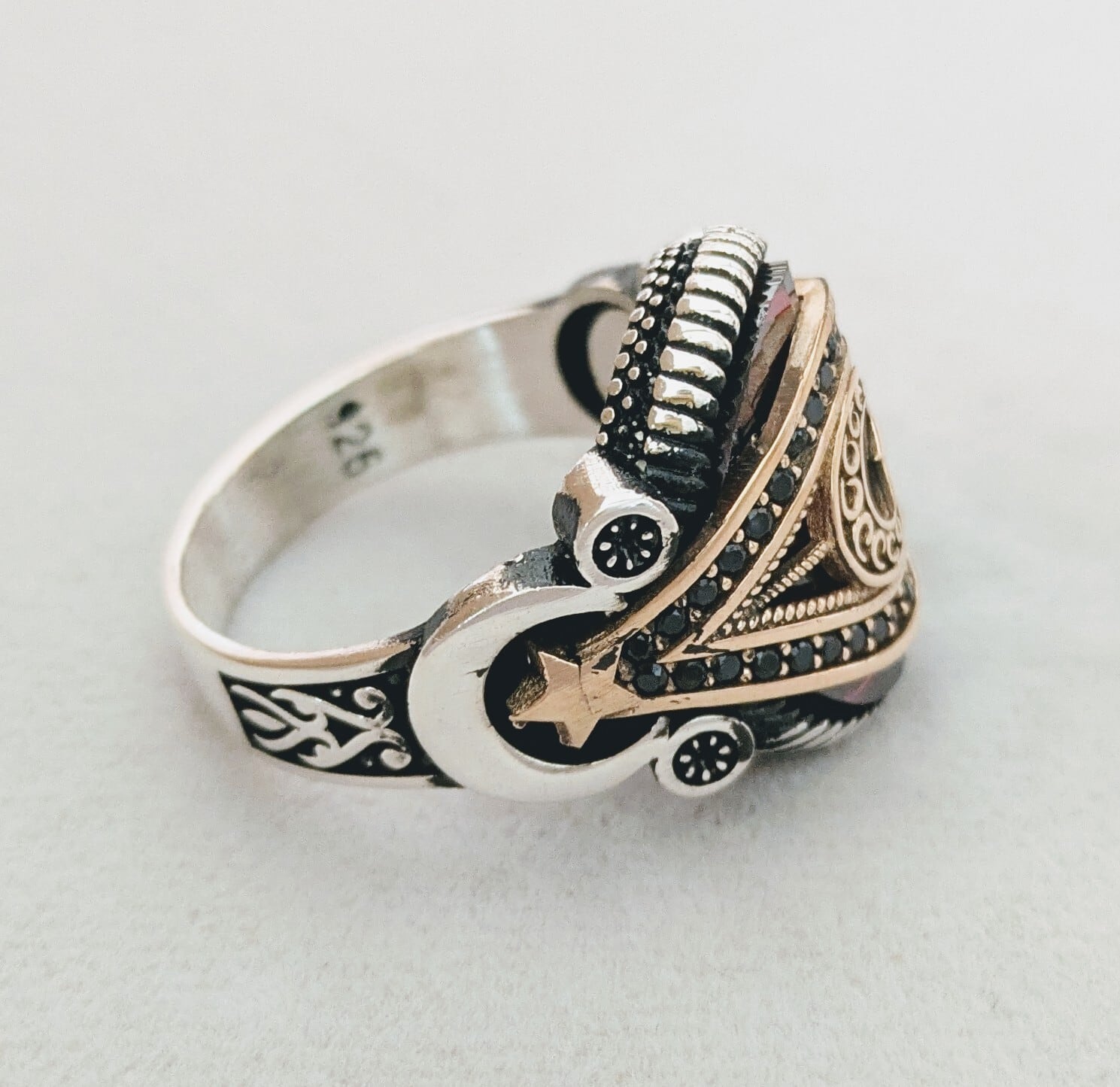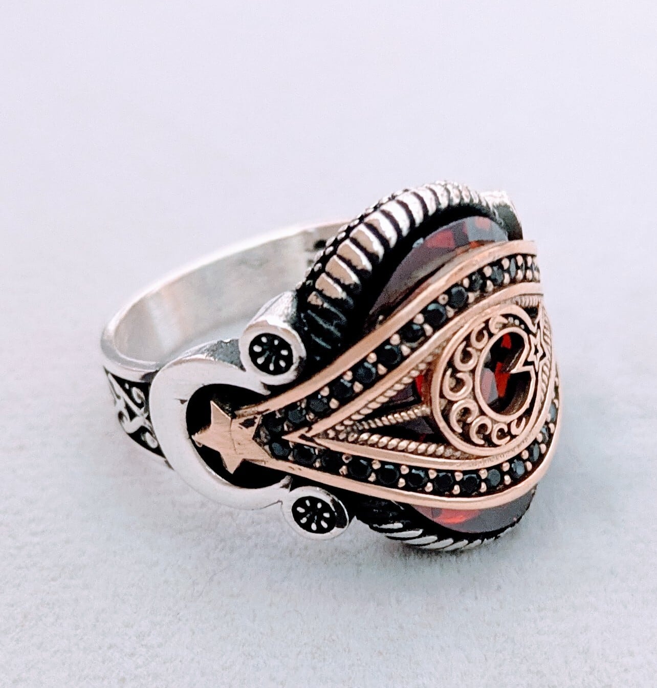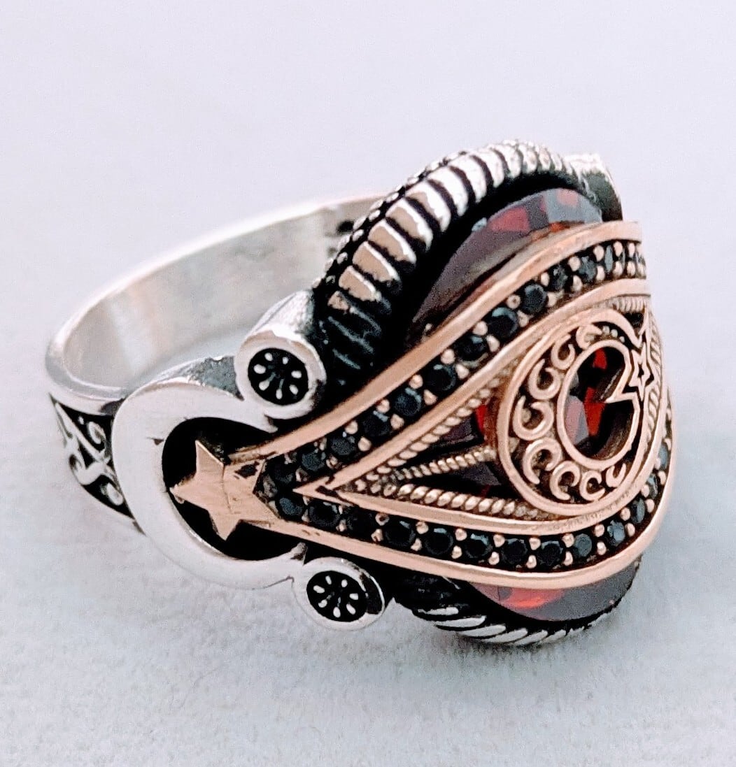 トップ部分には大粒の赤いジルコニア、それを覆うように金メッキで作られたトルコ国旗(月&星)を配置し、両脇部分にも月と星が施されているという、大変凝った作りで、ブラック、シルバー、ゴールドのバランスがとても素敵なボリュームリングに仕上がっています。