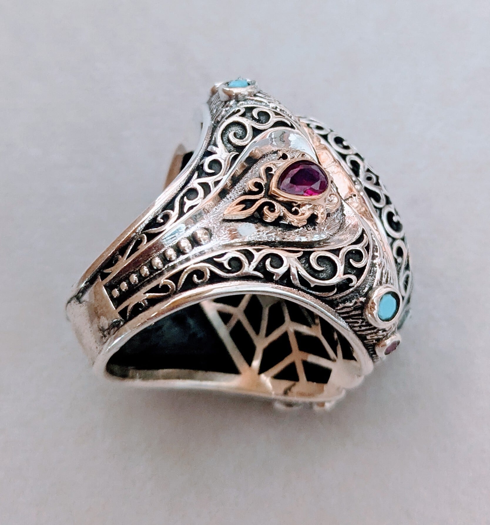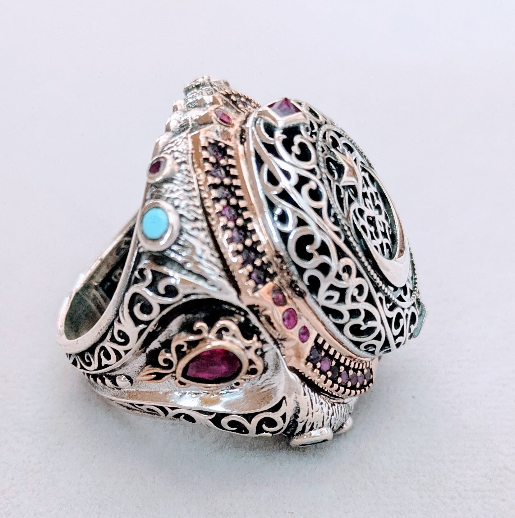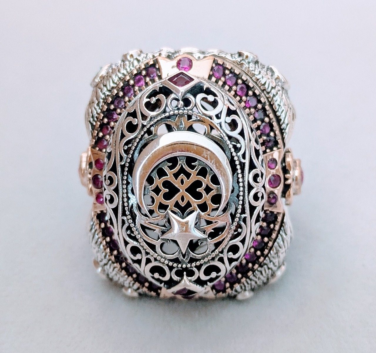 トップ部分はテルキャリスタイルの細かなモチーフにトルコ国旗の『月&星』、側面には赤やターコイズブルーのジルコニア、ルーミと呼ばれる「永遠をあらわす植物」のモチーフを施したリングです。