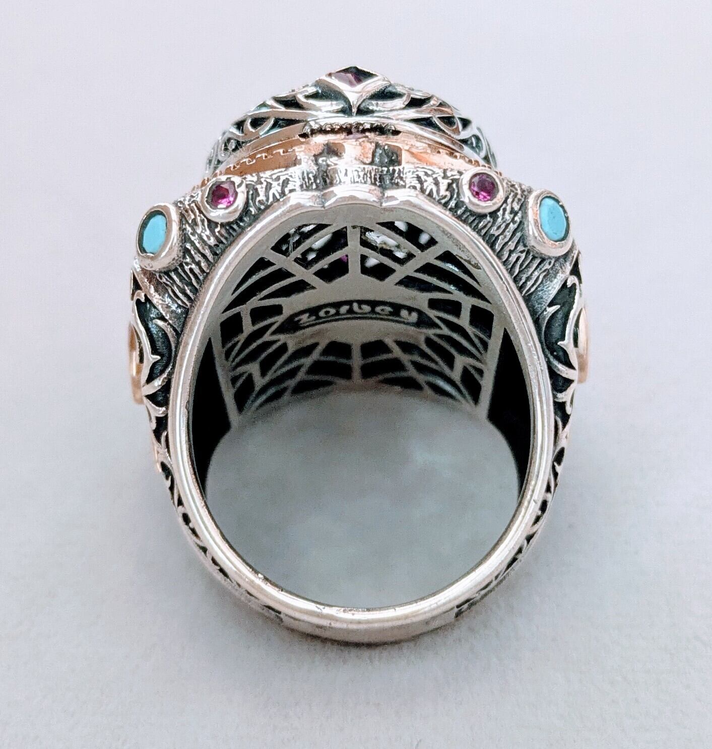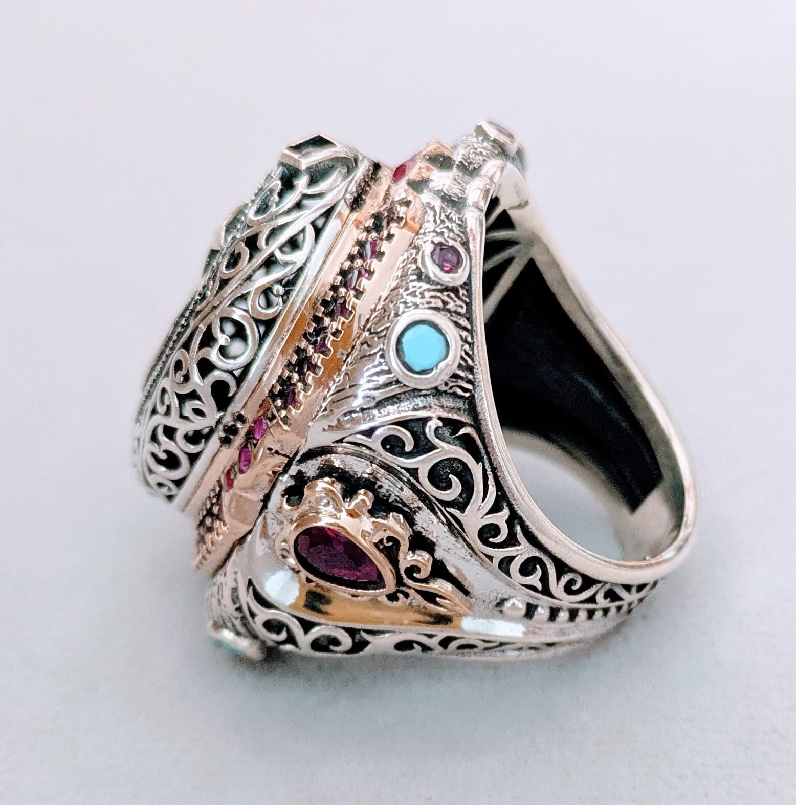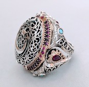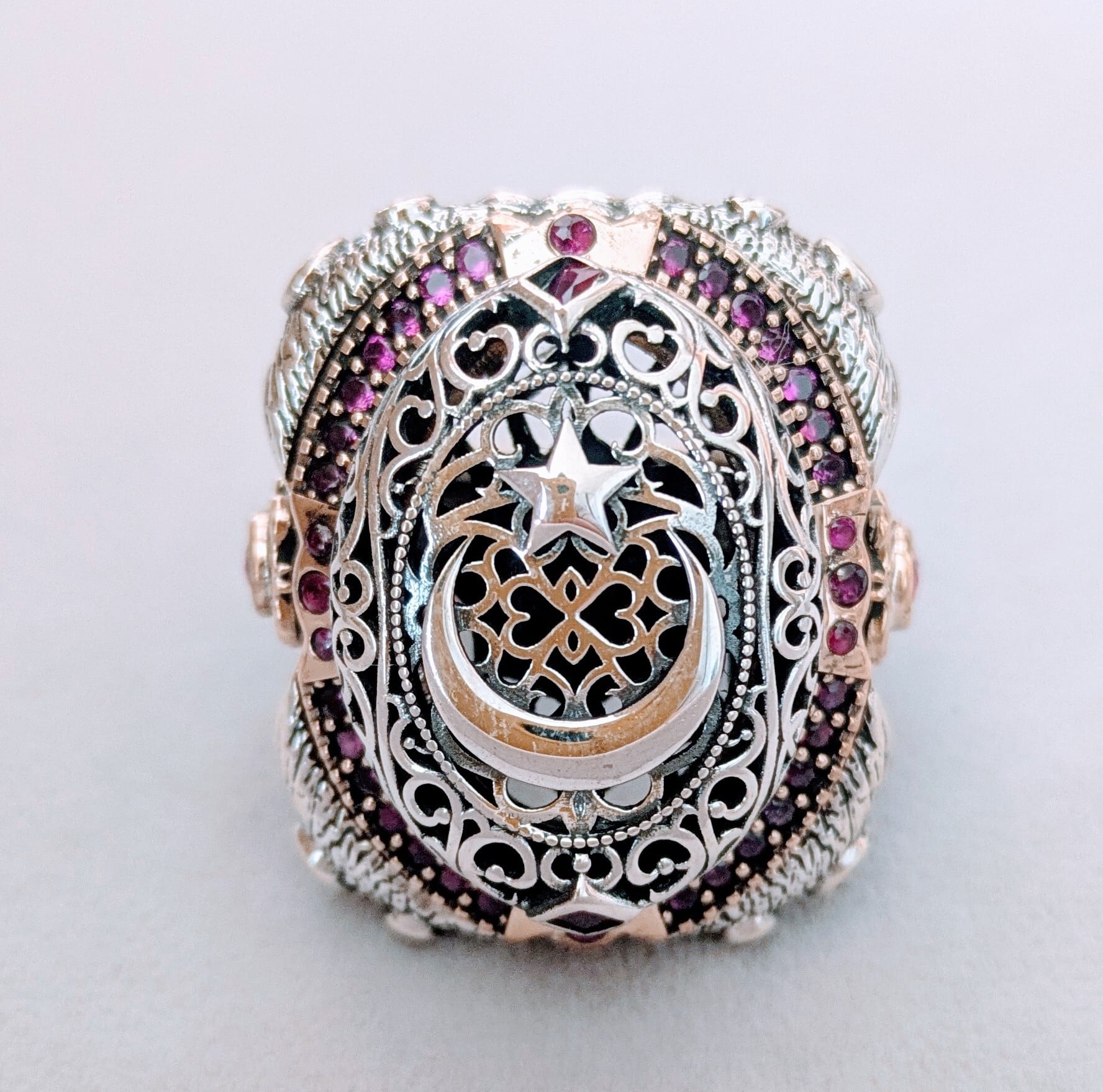 トップ部分はテルキャリスタイルの細かなモチーフにトルコ国旗の『月&星』、側面には赤やターコイズブルーのジルコニア、ルーミと呼ばれる「永遠をあらわす植物」のモチーフを施したリングです。