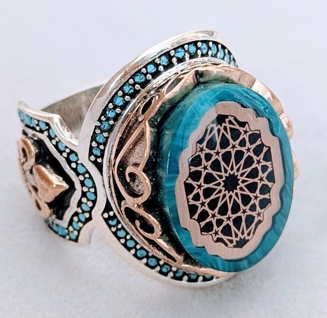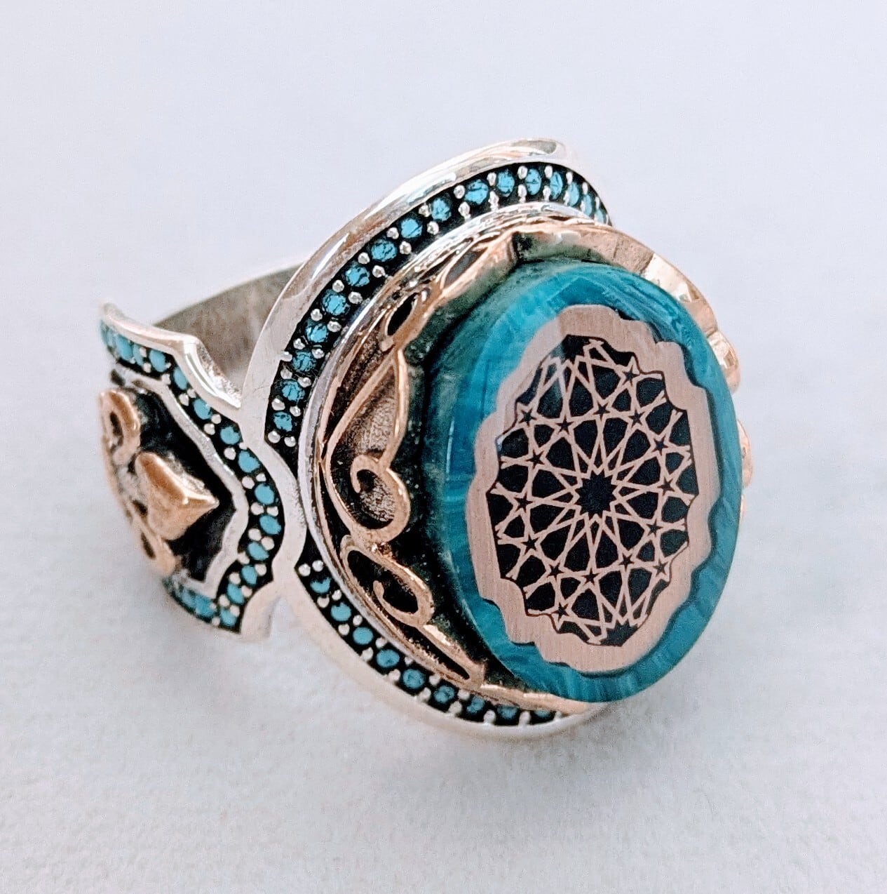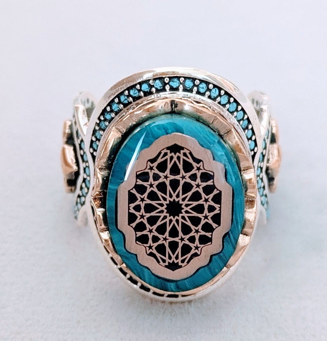 エナメル加工のツヤと周囲に施されたターコイズブルーのジルコニアが美しさを引き立てるクールで上品なリングです。