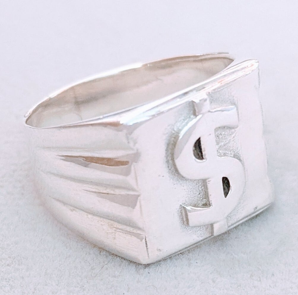 $(ドル)をモチーフにし、敢えて石を使わずシルバーだけでモチーフの存在感を表現した、シンプルでインパクトのある仕上がりになっています。