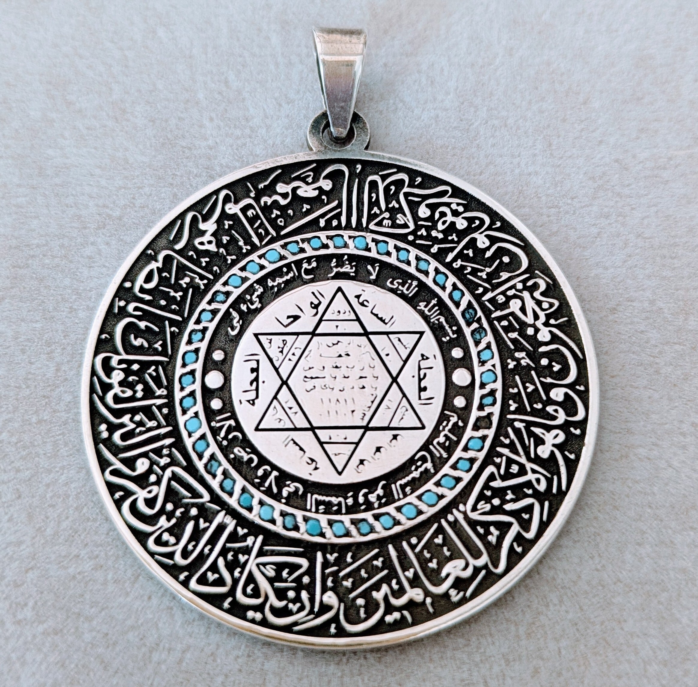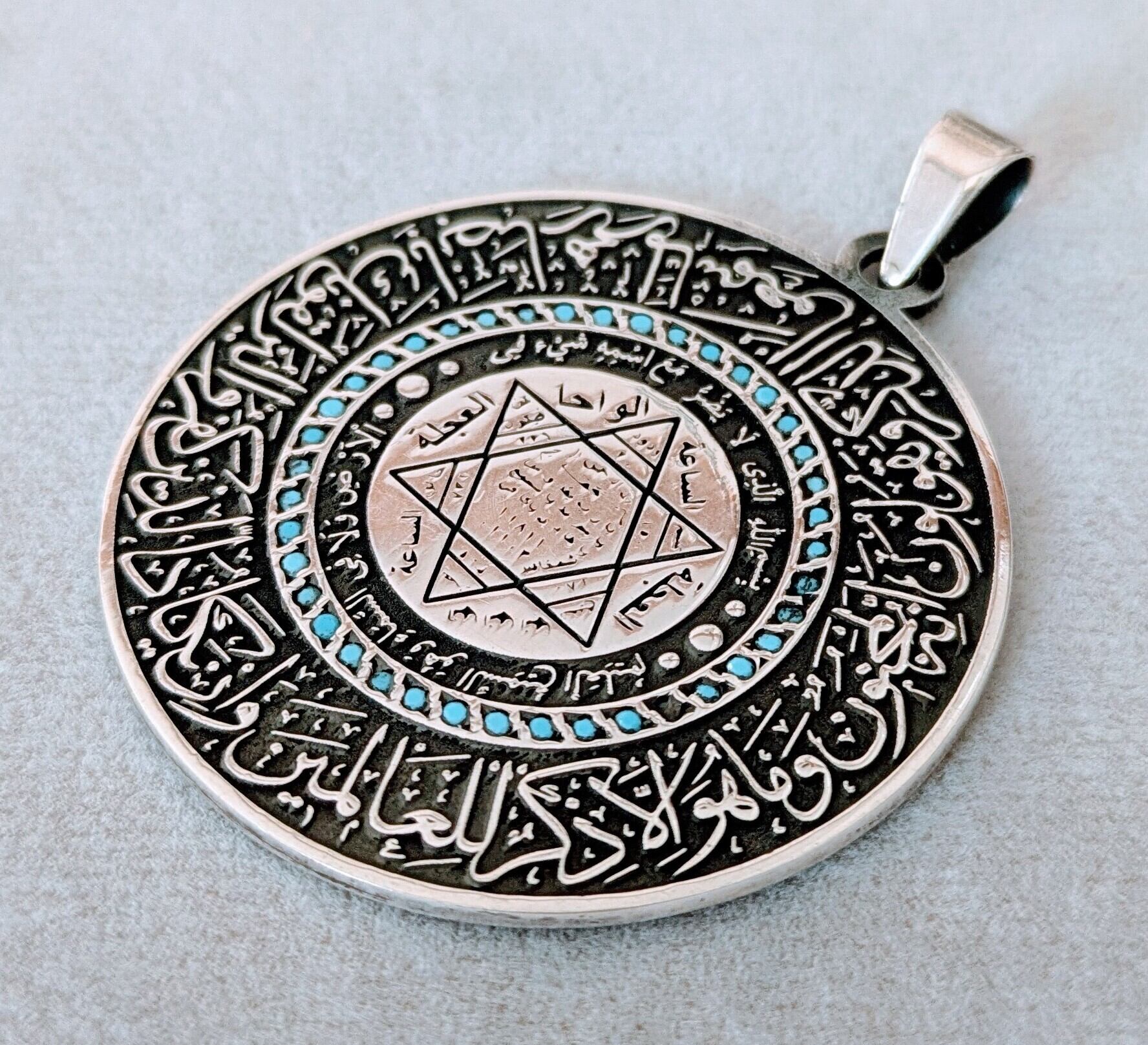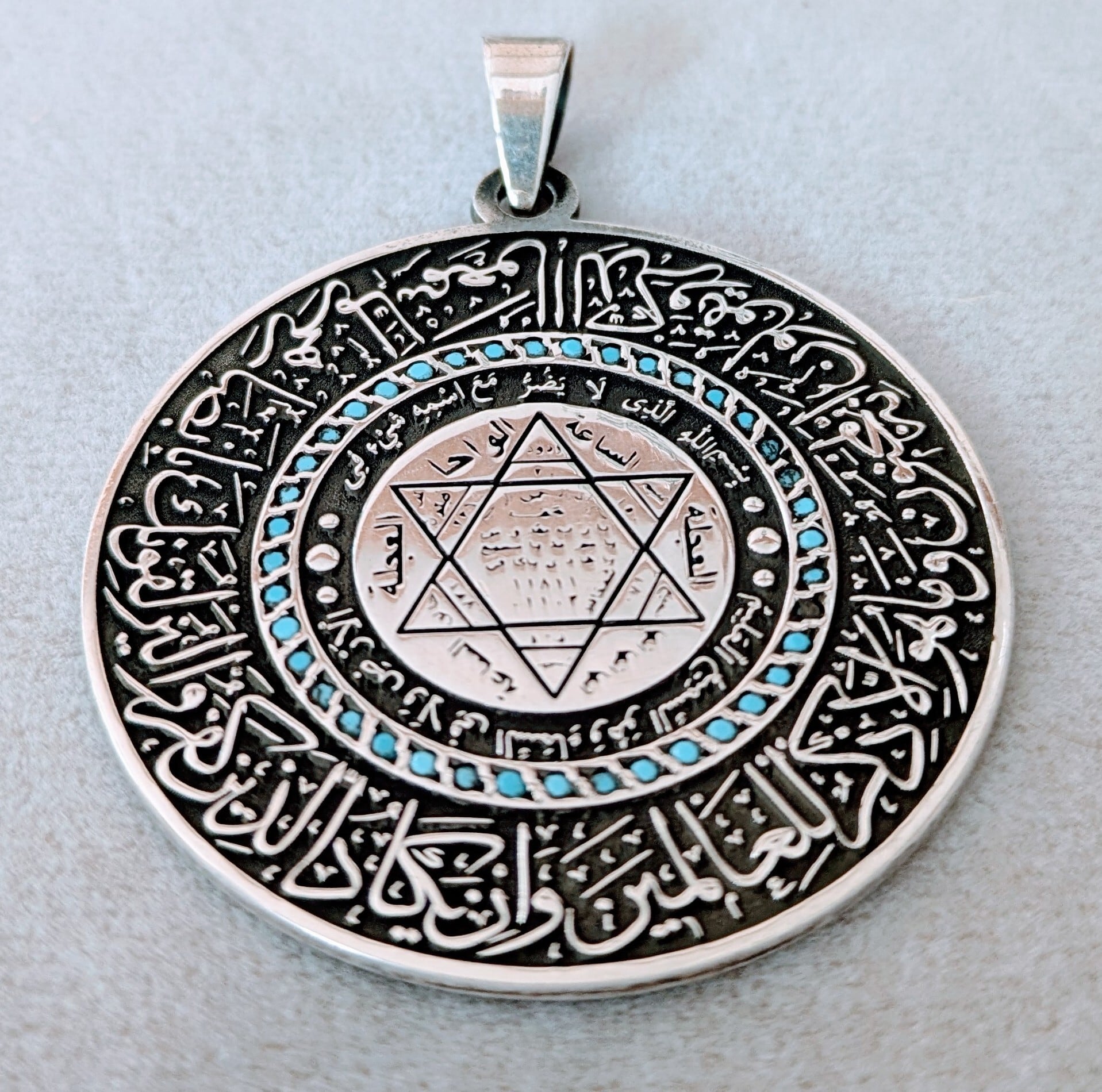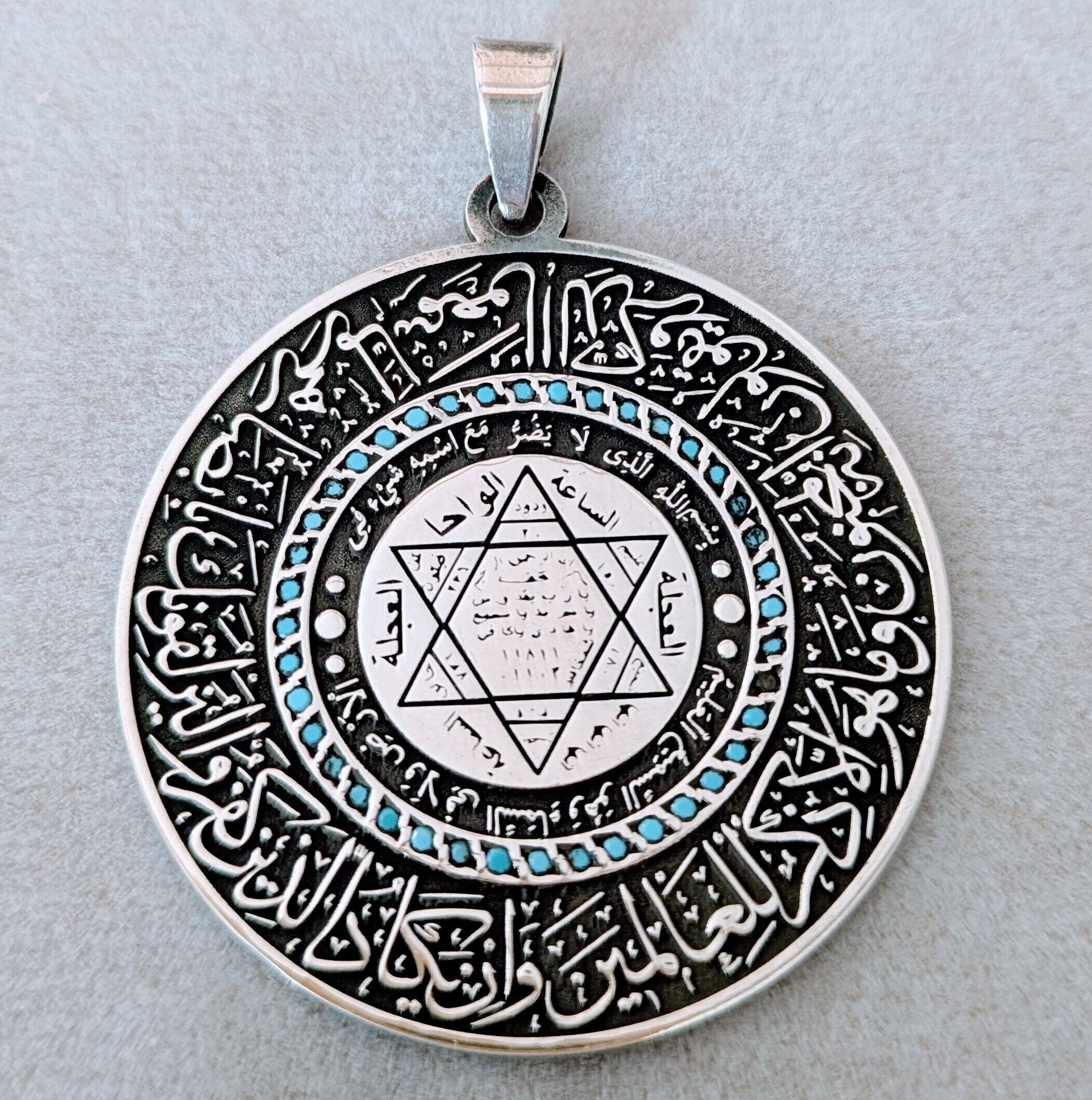 中央に六芒星(ヘキサグラム)(ダビデの星とも呼ばれます)が描かれ、周囲にはアラビア語のカリグラフィが施されています。六芒星の起源は古代に遡り、様々な文化で調和や保護を象徴する普遍的なシンボルとして用いられてきました。