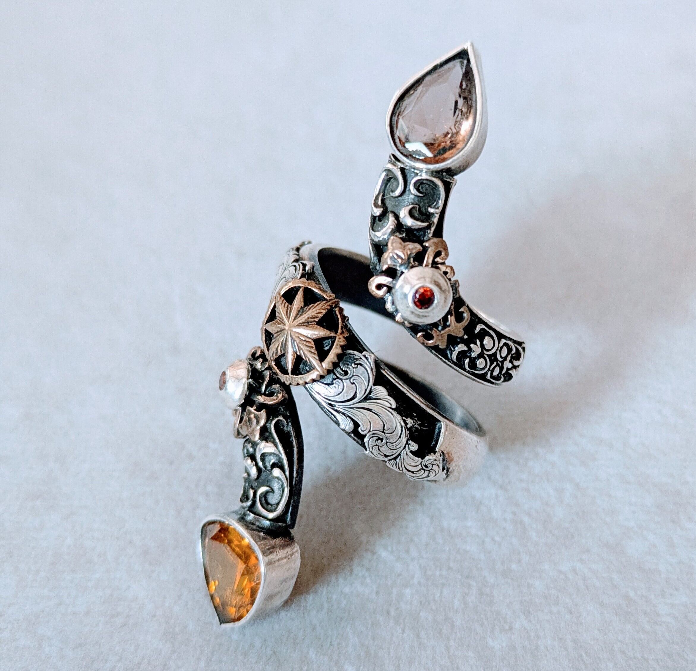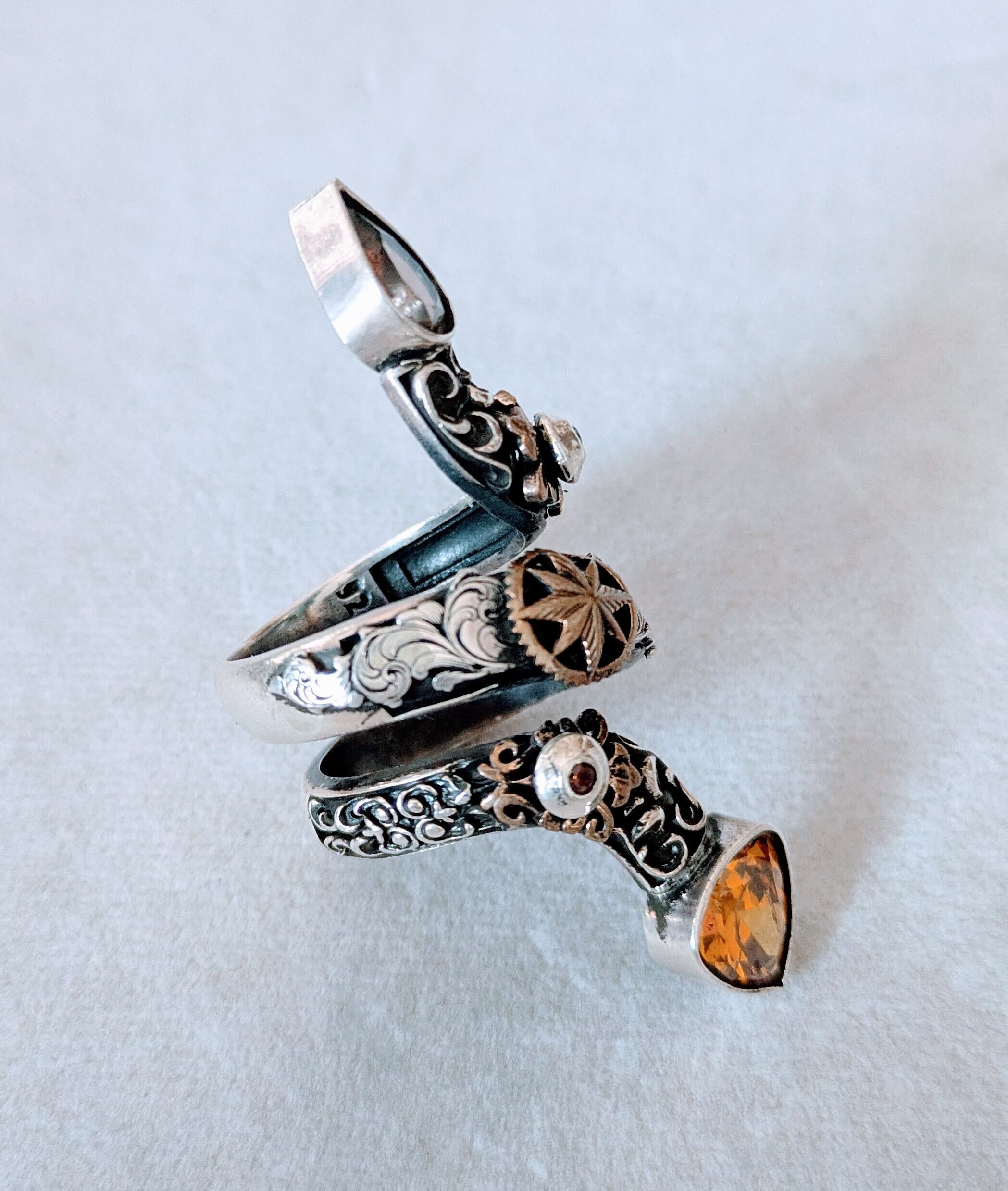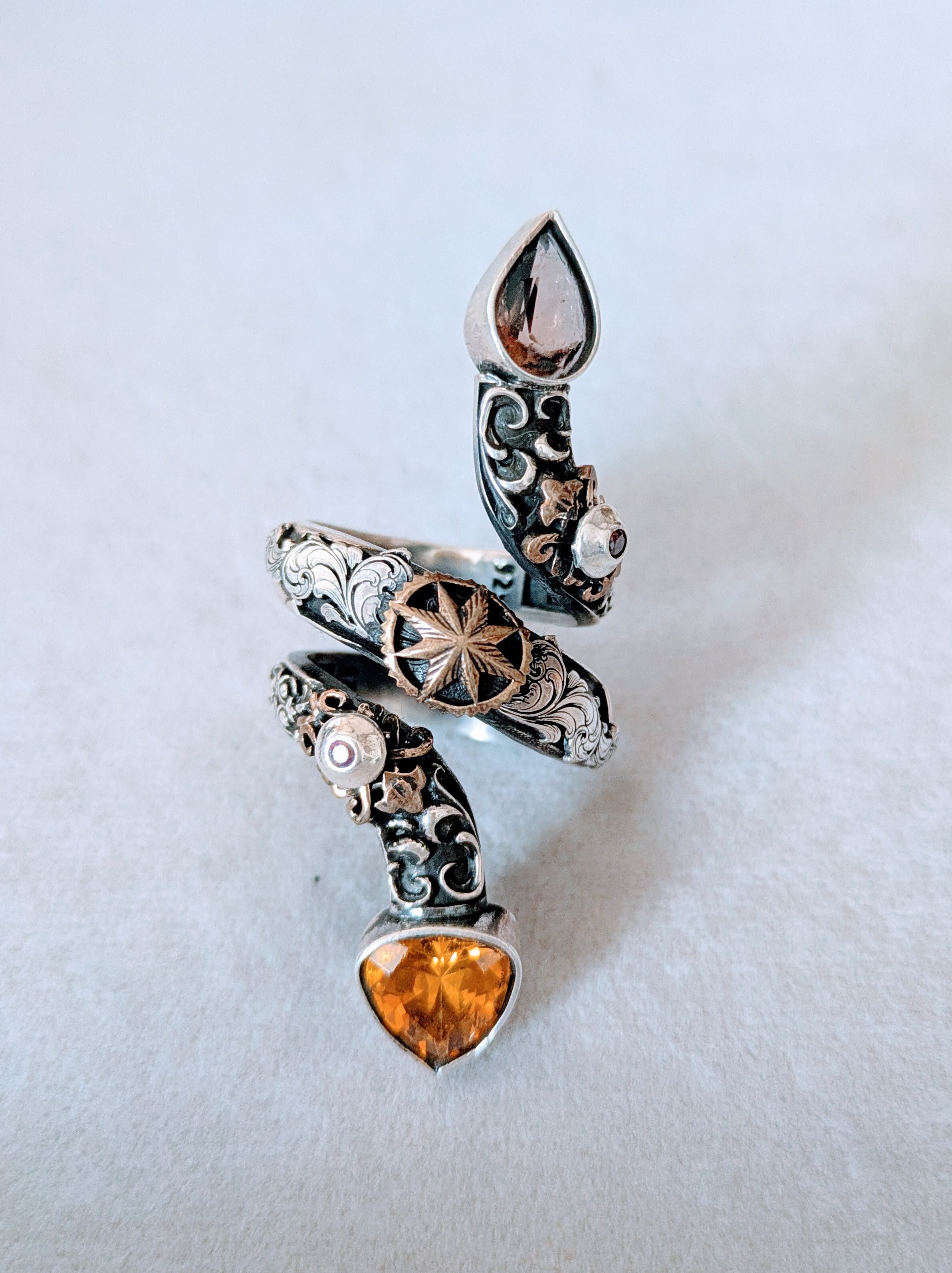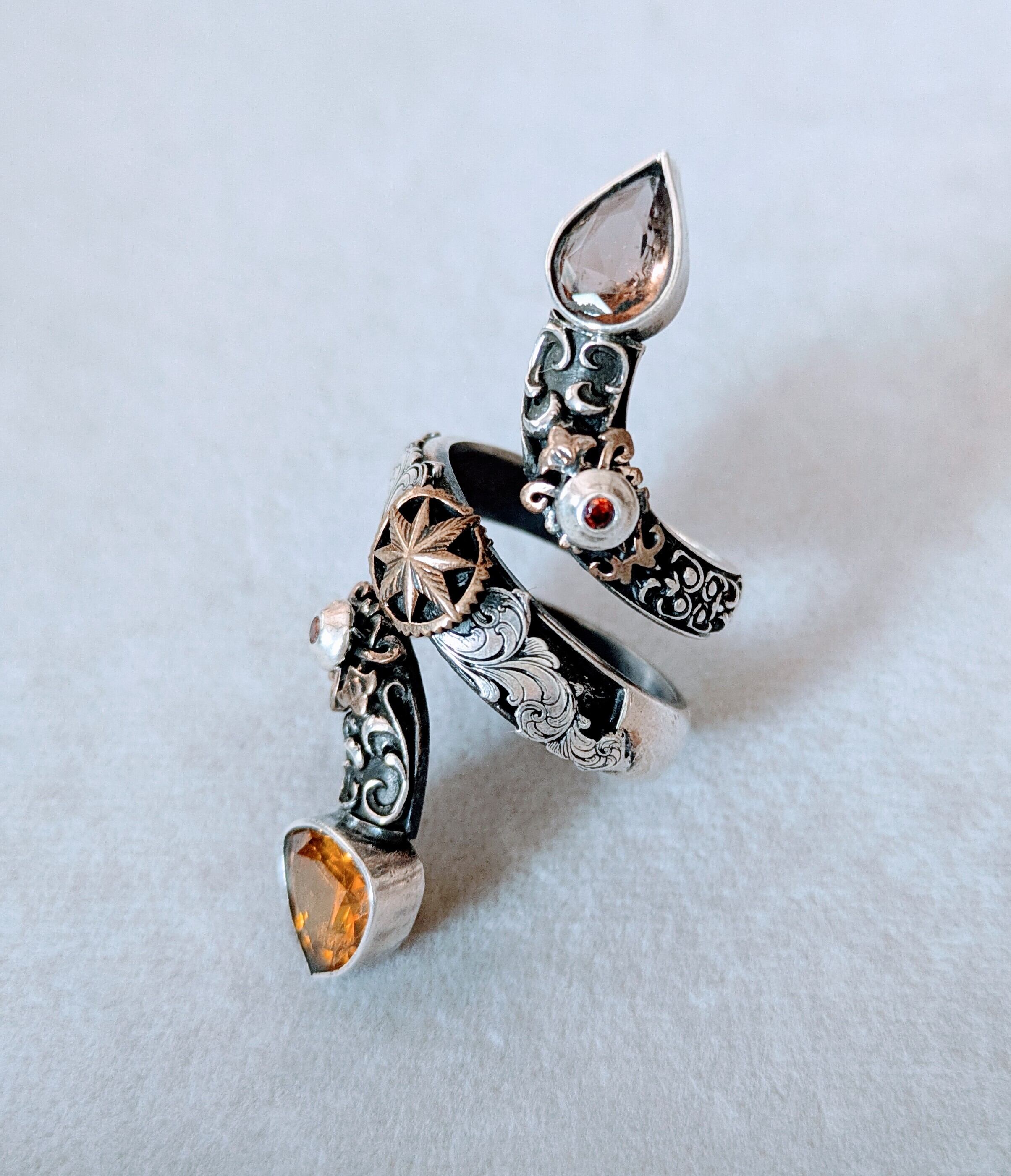 星の涙から生まれ暗闇で迷った人々に道を示すこの指輪は「光と影の両方を運ぶ者だけが着用できる」という伝説からのオマージュで両端のズルタナイトとシトリンが暗闇から見た太陽を表し、彫刻技法を用いて仕上げております。