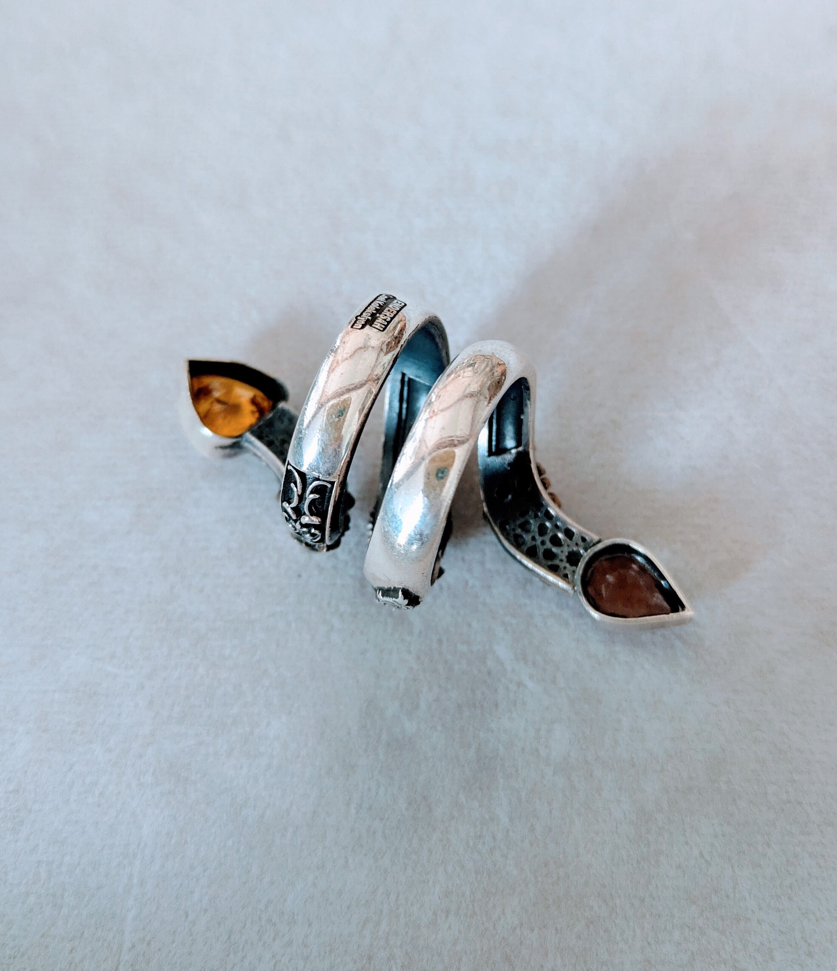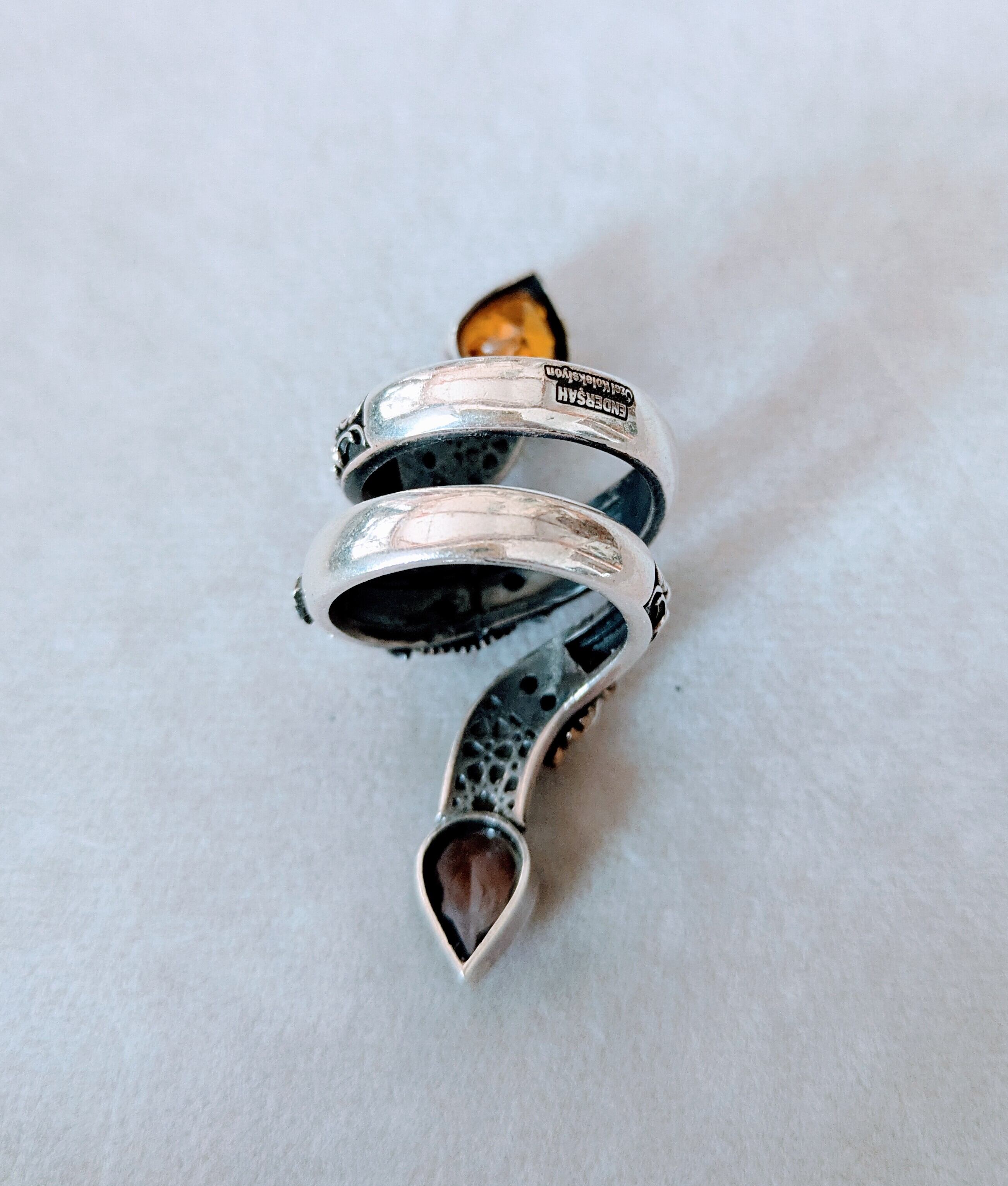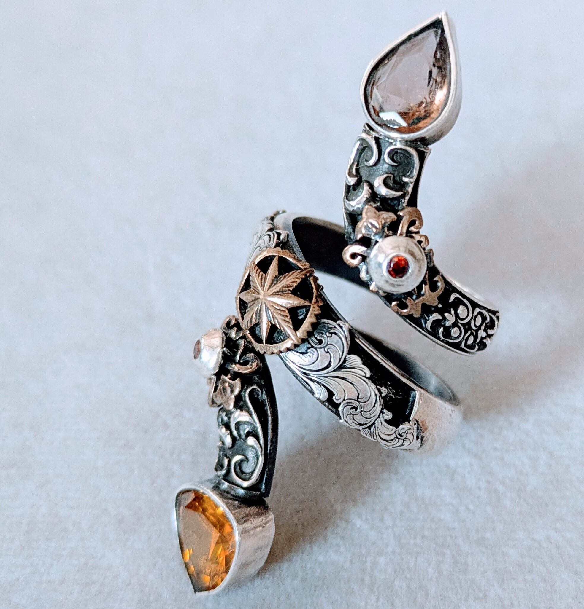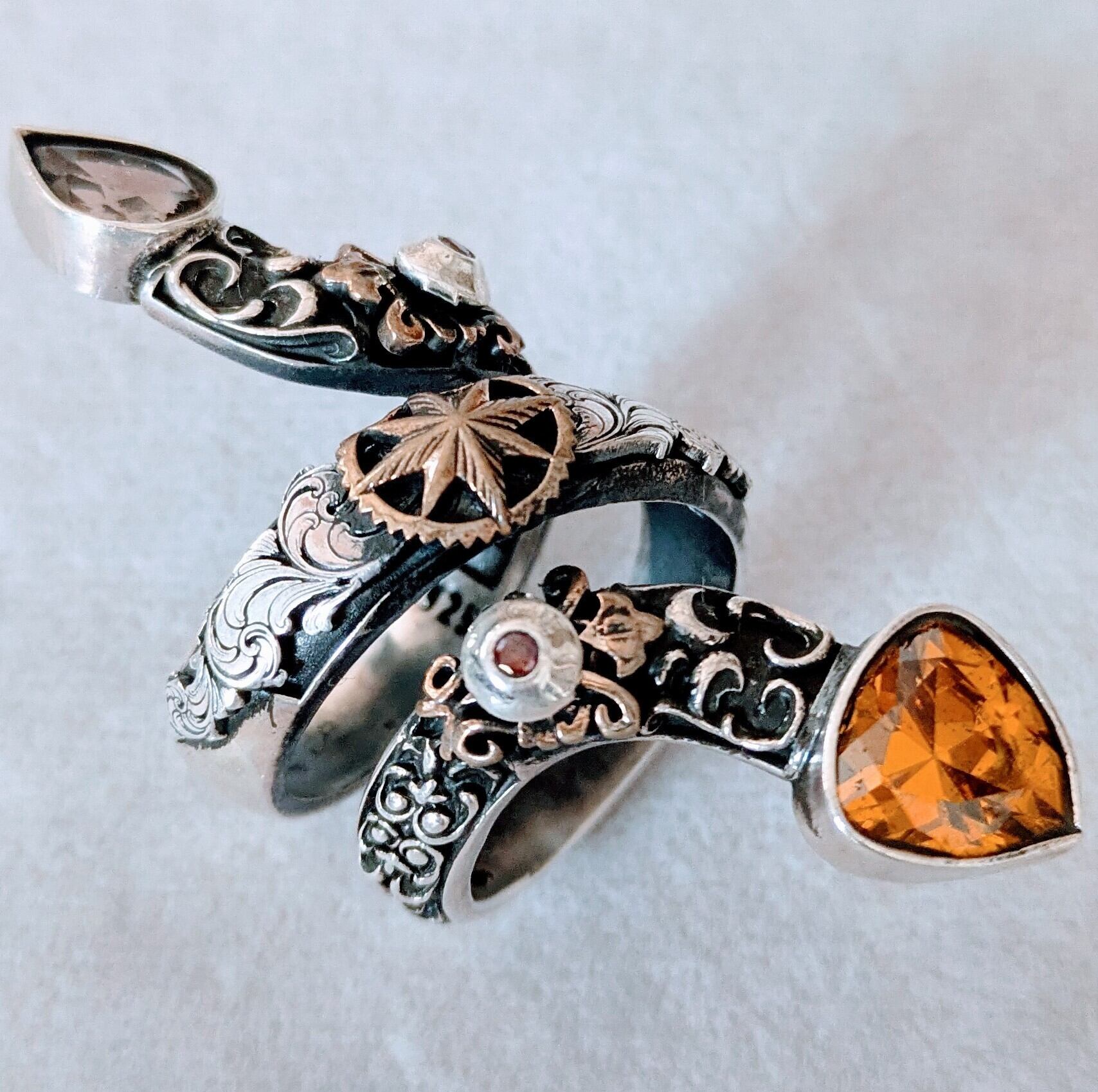 星の涙から生まれ暗闇で迷った人々に道を示すこの指輪は「光と影の両方を運ぶ者だけが着用できる」という伝説からのオマージュで両端のズルタナイトとシトリンが暗闇から見た太陽を表し、彫刻技法を用いて仕上げております。