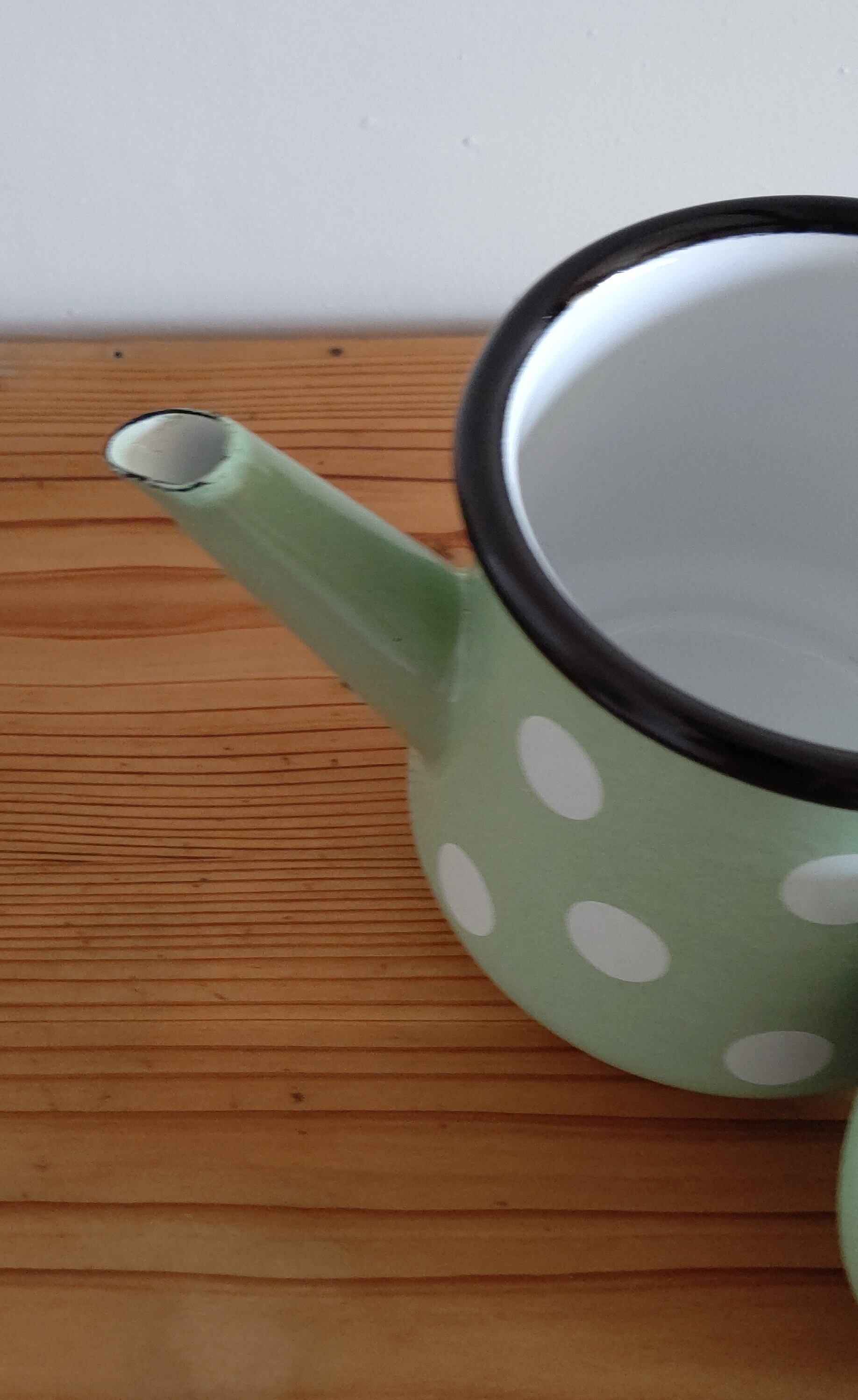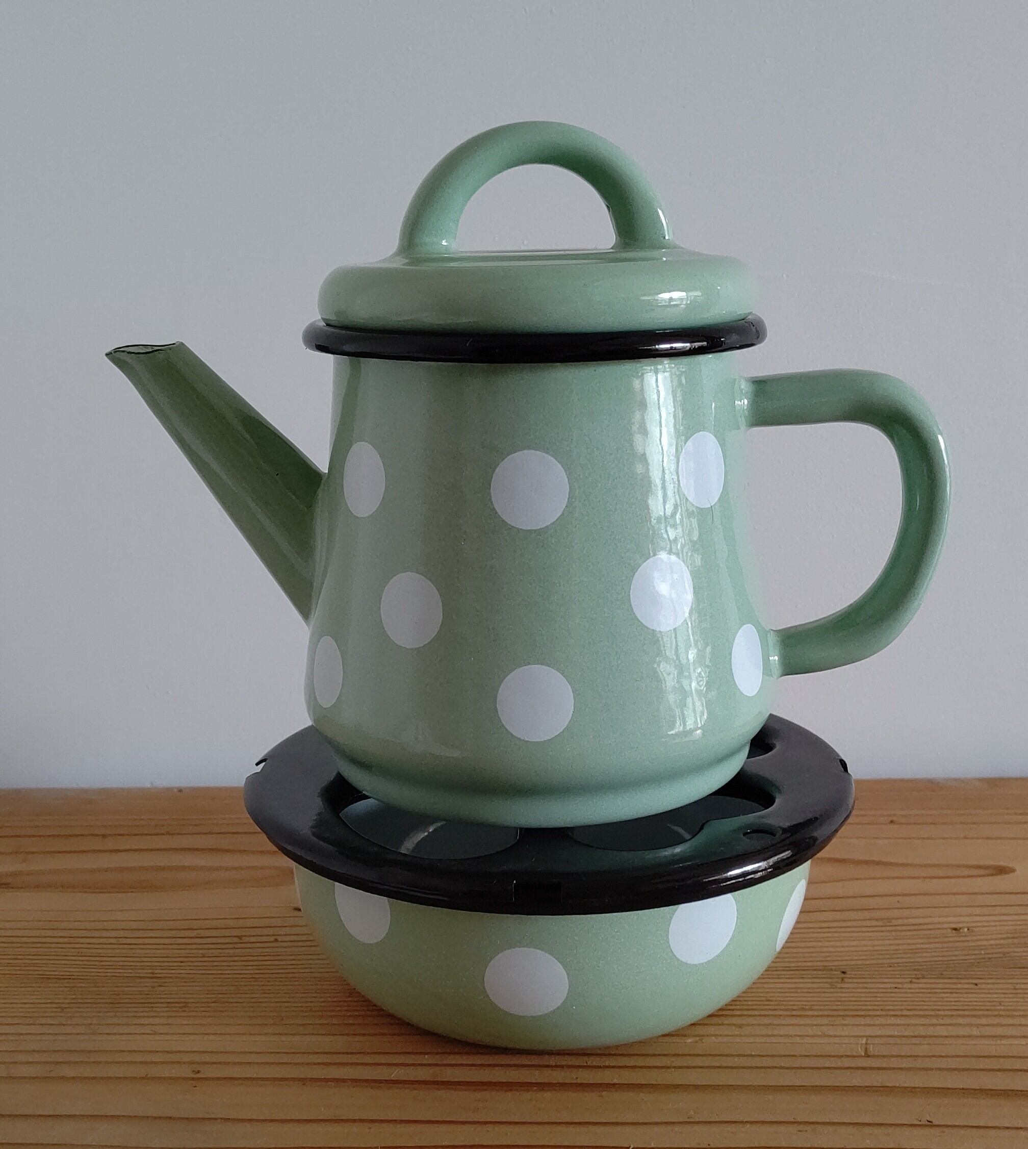 ポッテリとした形が可愛いホーローのポットと炭受け皿(ボウル)のセットです。