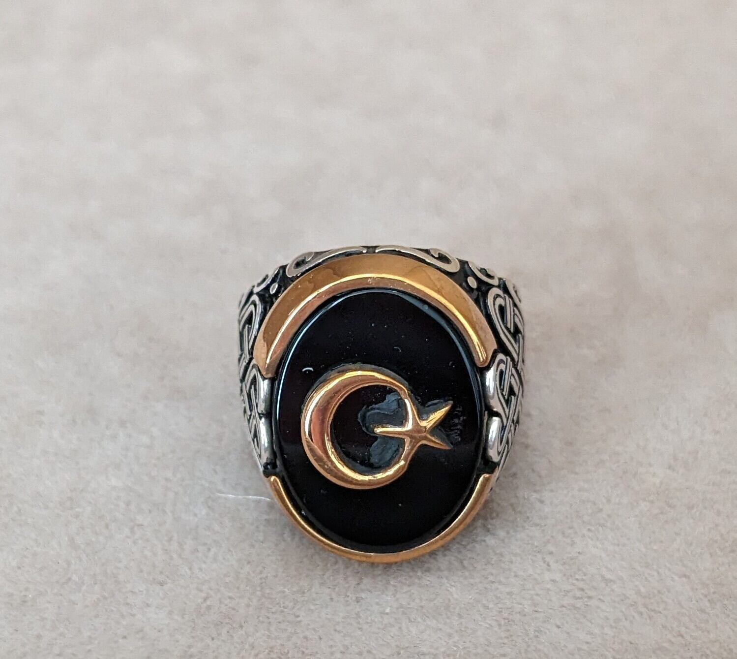 トップ部分には天然石のオニキスをベースとして『月&星』でトルコ国旗を表現し、両脇には生命と健康を守る象徴と言われる『絡まるヘビ』のモチーフを施し、ボリュームも存在感も十分にあるとてもカッコいいボリュームリングに仕上がっています。