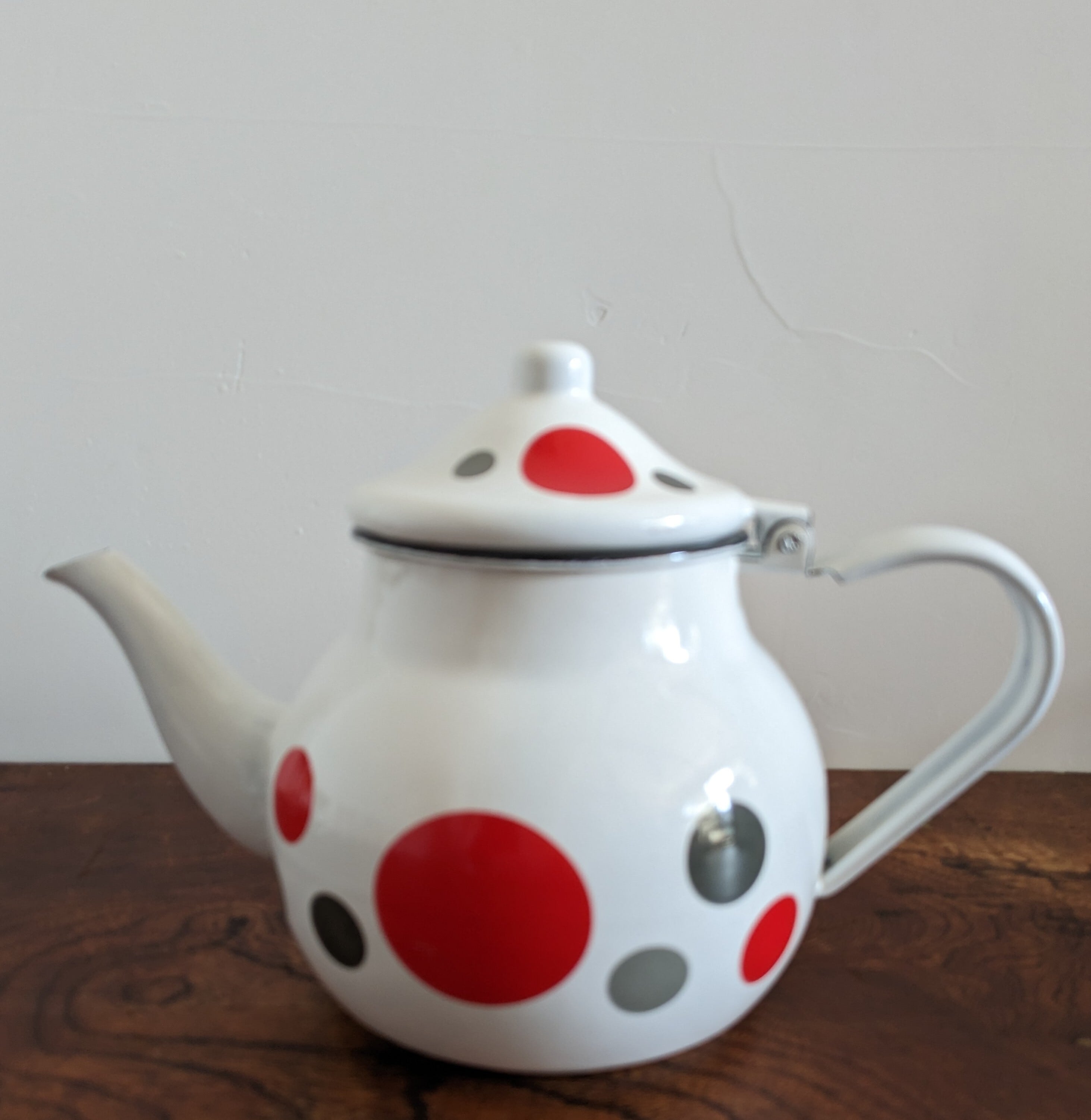 なんだか懐かしい雰囲気のドット柄と色遣いがレトロ感たっぷりで、コロンと安定感のあるスタイルなので、キッチンだけでなく、アウトドアでお使いいただいても安心です。