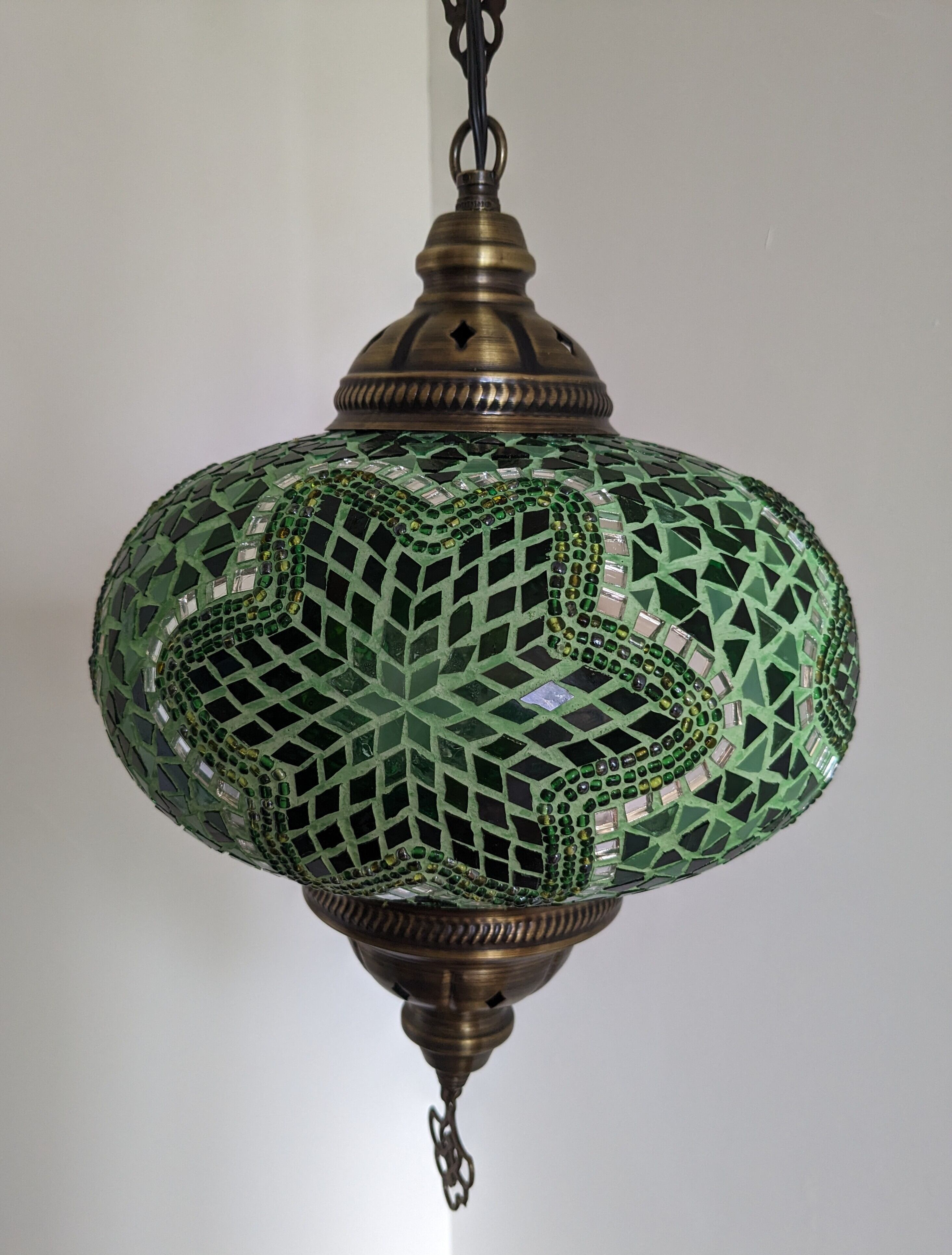 トルコ人女性のモザイクランプ作家さんが心を込めて制作した、ハンドメイドのペンダントタイプのランプです。