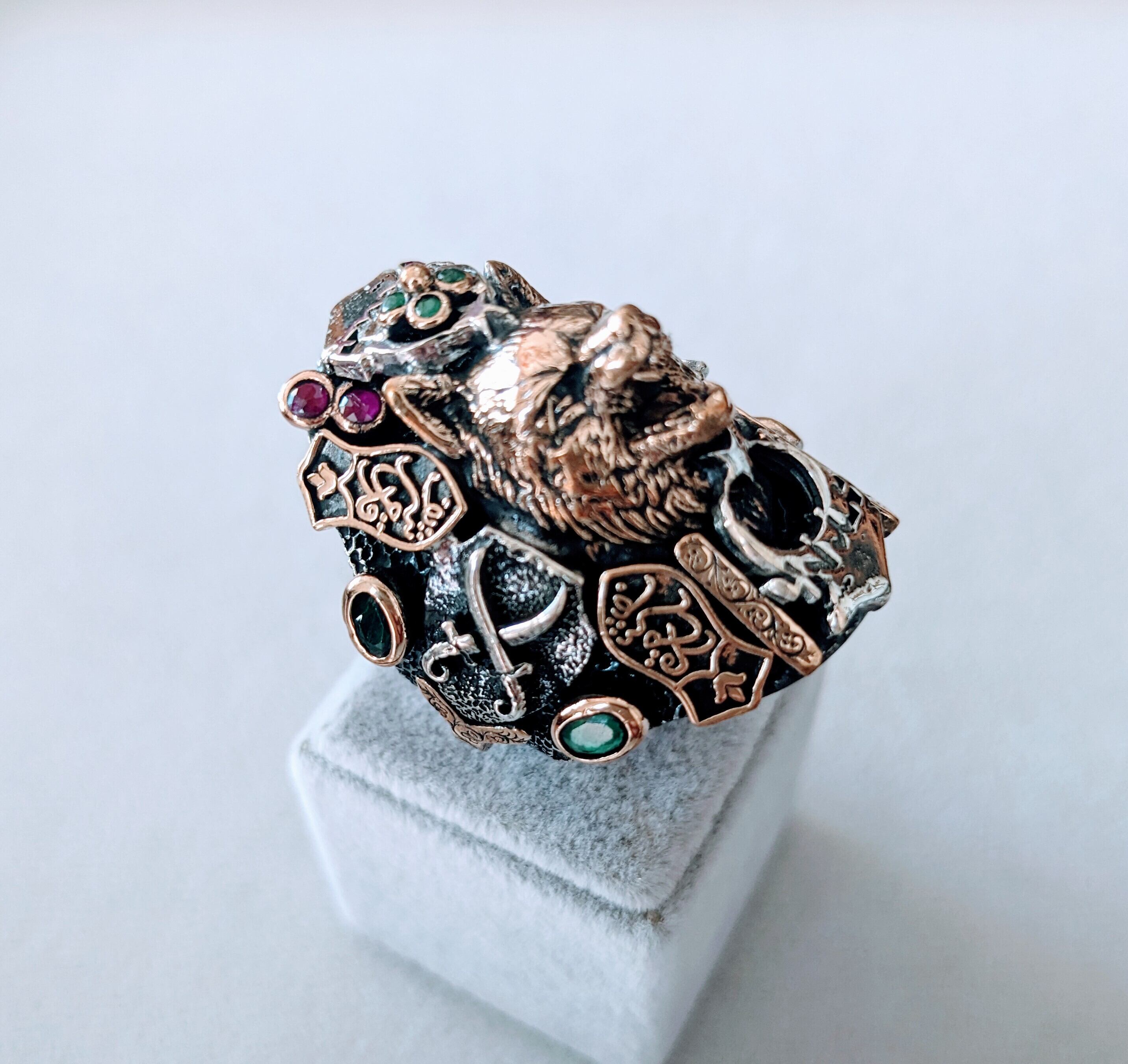 モチーフの中心には自由・強さ・魔除け・成功の意味を持つ精悍な顔つきの狼(オオカミ)、それを囲むようにトルコ国旗、剣や盾を配置、ルビーとエメラルドで華やかさを演出した豪華なデザインで、リング部分にはブラックロジウムコーティングが施されていることで渋さも加わった中々出会うことの出来ない重厚感のあるアクセサリーとなっています。