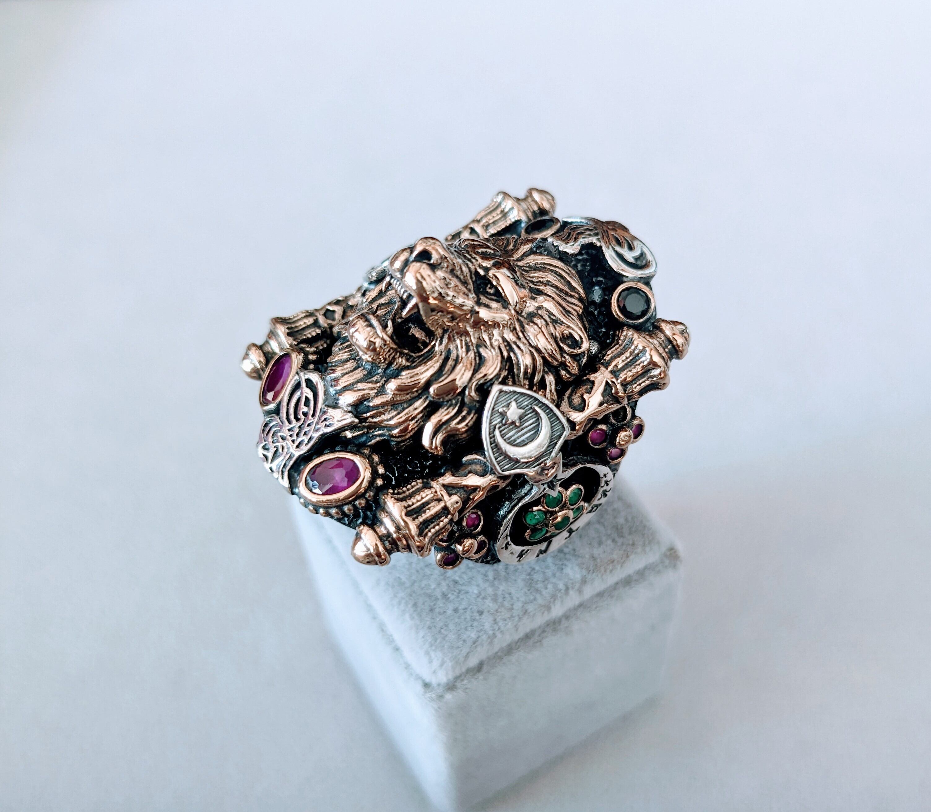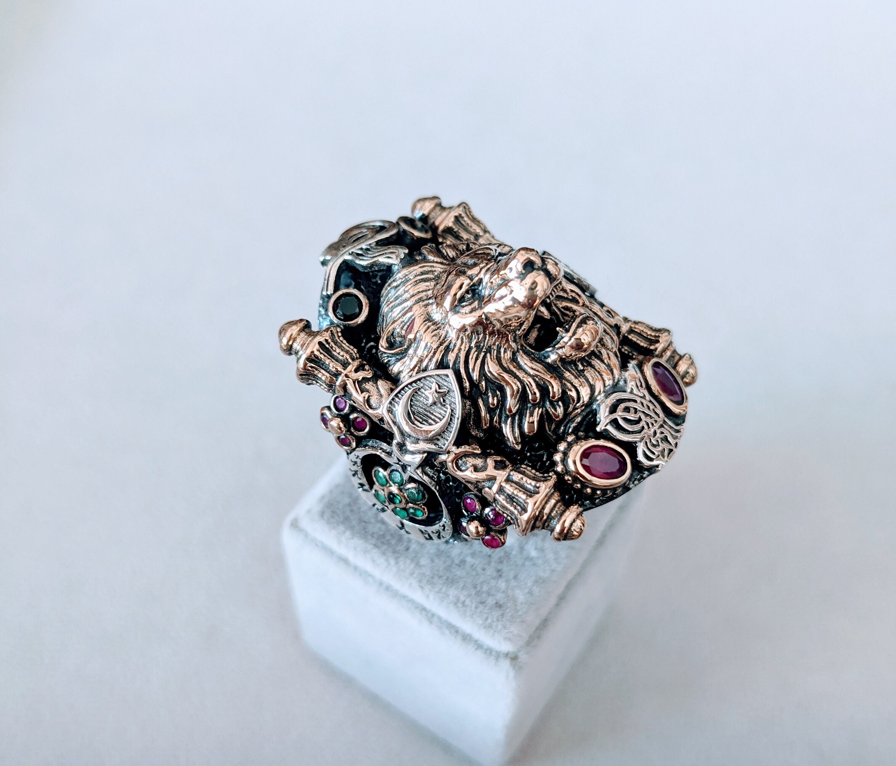 モチーフの中心には強さ・リーダー・成功の意味を持つ精悍な顔つきのライオン狼(獅子)、それを囲むようにオスマン帝国のロゴ、ルビー、サファイア、エメラルド、ジルコニアを配置した豪華なデザインで、リング部分にはブラックロジウムコーティングが施されていることでアンティークのような渋さも加わった中々出会うことの出来ない重厚感のあるアクセサリーとなっています。