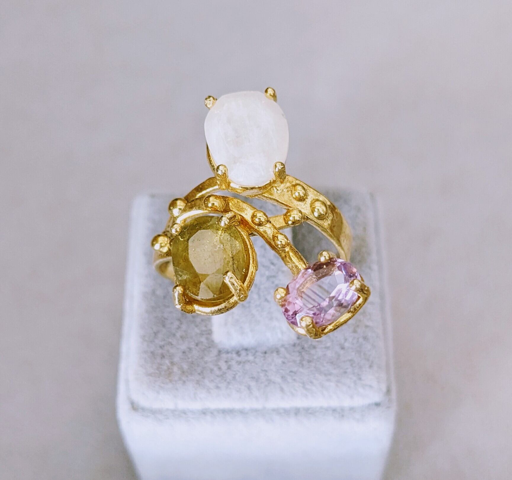 モチーフには18金でコーティングされた茎にムーンストーン、サファイア、アメジストの花が咲いたような女性らしく美しいデザインのリングです。
