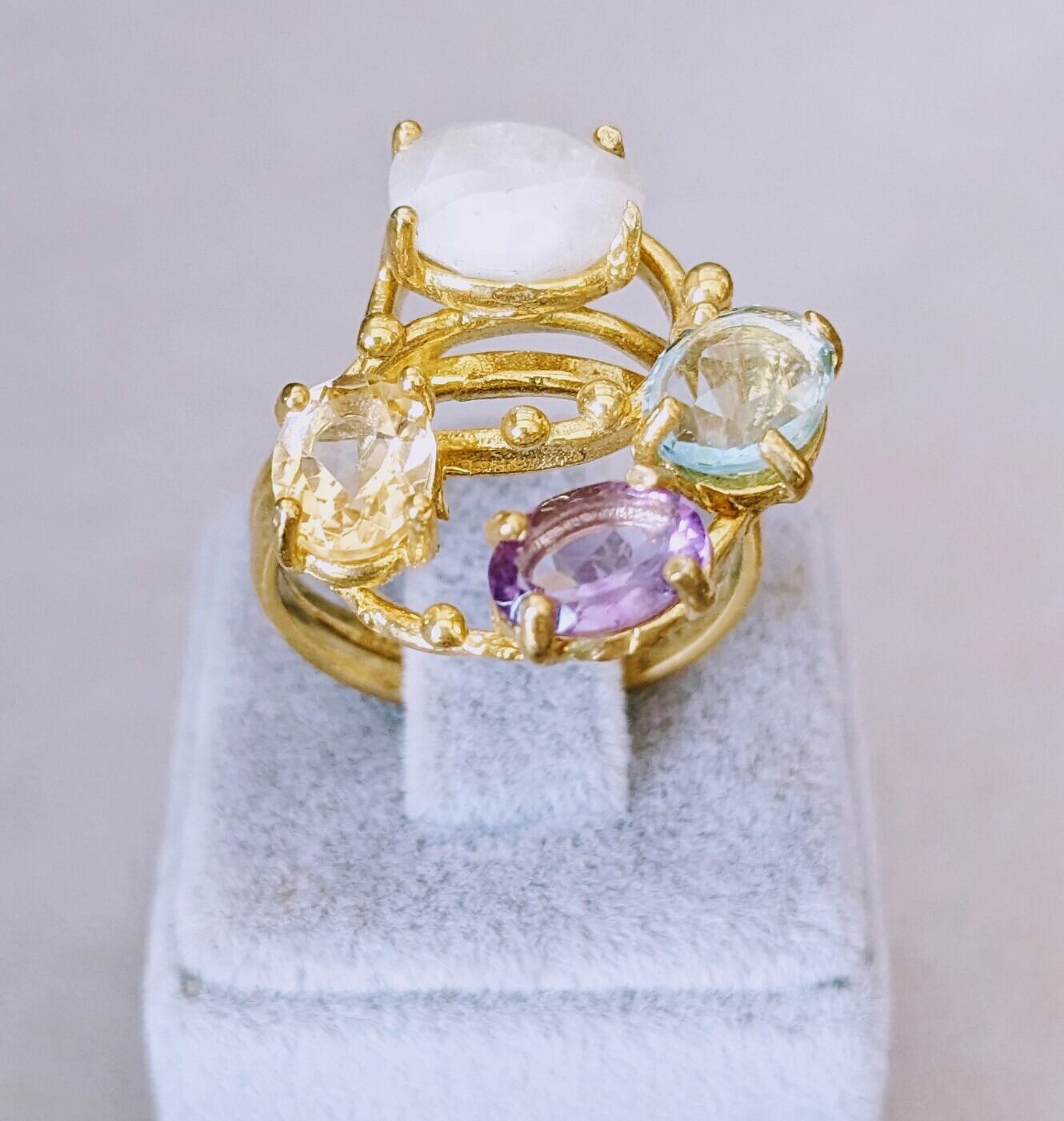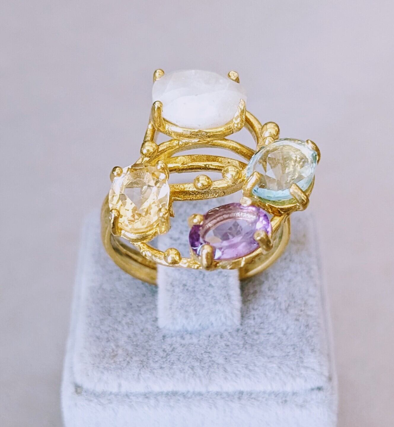 モチーフには18金でコーティングされた茎にムーンストーン、シトリン、ブルートパーズ、アメジストの優しい色の花が咲いたような女性らしく美しいデザインのリングです。