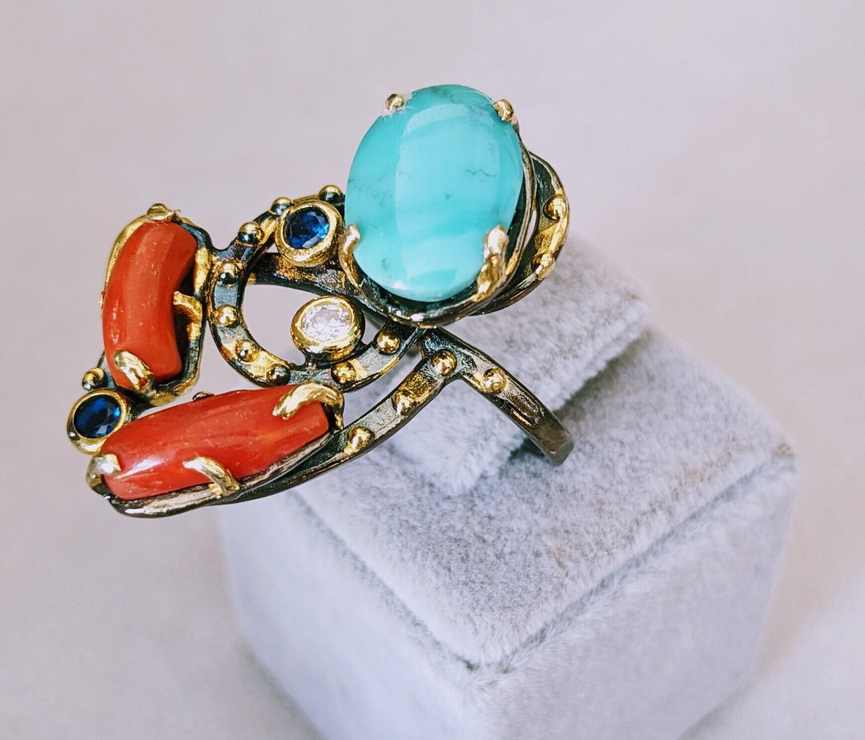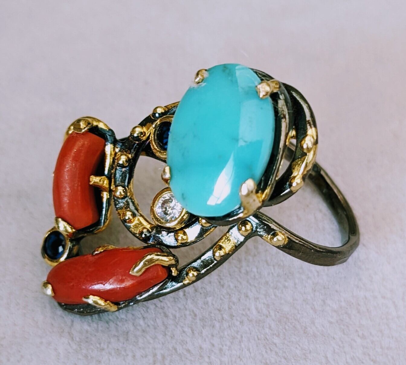 ターコイズの中でも最高級と言われるアリゾナターコイズと赤珊瑚の色のコントラストが鮮やかなユニークなデザインのリングです。