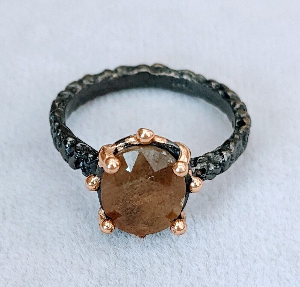とてもシンプルなスタイルのイエローサファイアを18金コーティングのコロンとした石座が支え、リング部分はハンドメイドならではの凹凸感のある細めのスタイルでブラックロジウムのコーティングがされていますので、大人っぽいシックなスタイルのリングです。