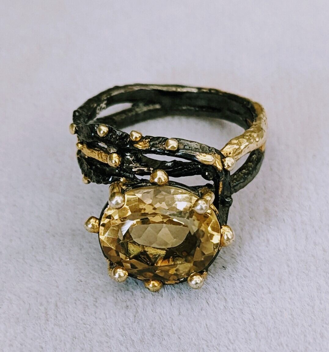 とてもシンプルなスタイルのシトリンの魅力をリング部分に施されたブラックロジウムコーティングと18金のモチーフが最大限に引き出しているシックなスタイルのリングです。