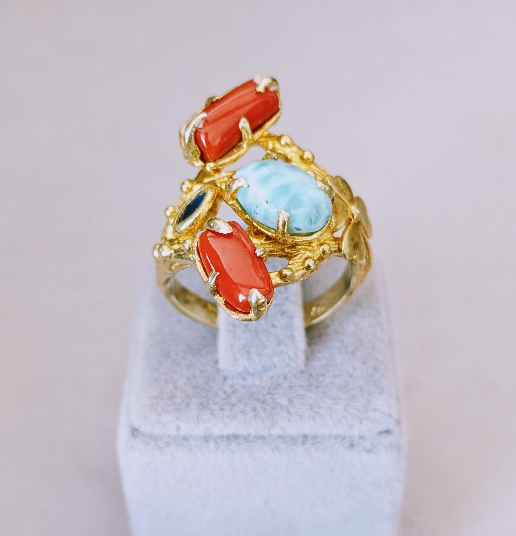 優しく柔らかな白い雲が浮かぶ青空のようなラリマーと赤珊瑚の色のコントラストが鮮やかでユニークなデザインのリングです。