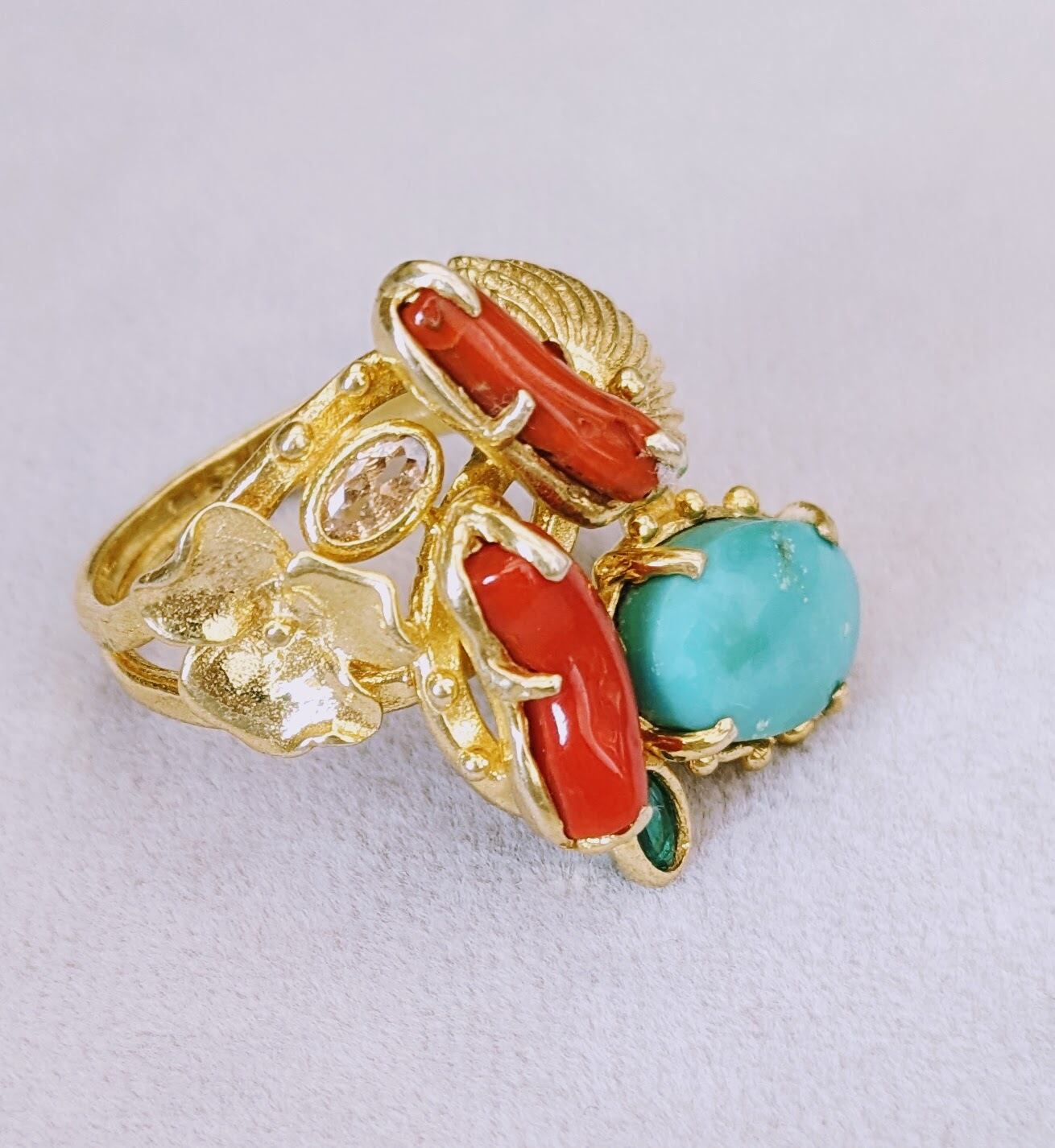 ターコイズの中でも最高級と言われるアリゾナターコイズと赤珊瑚の色のコントラストが鮮やかで、貝殻のモチーフと一緒になることで、まるで海の中をのぞいているような気分にさせてくれるリングです。