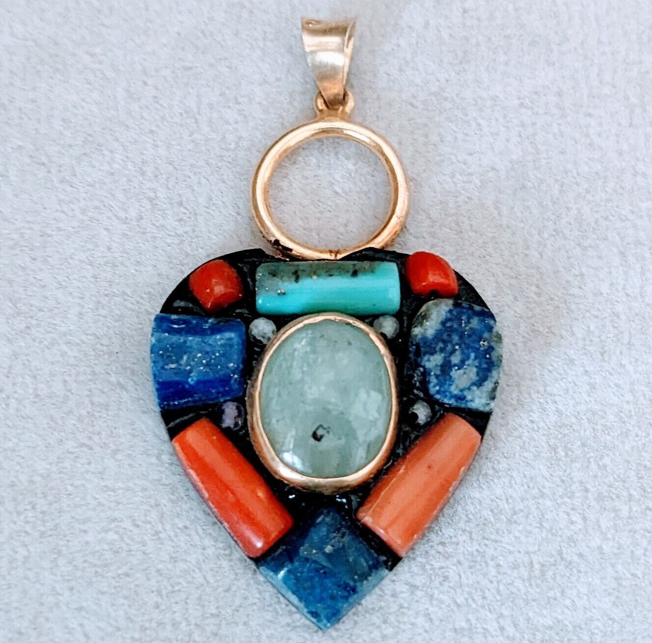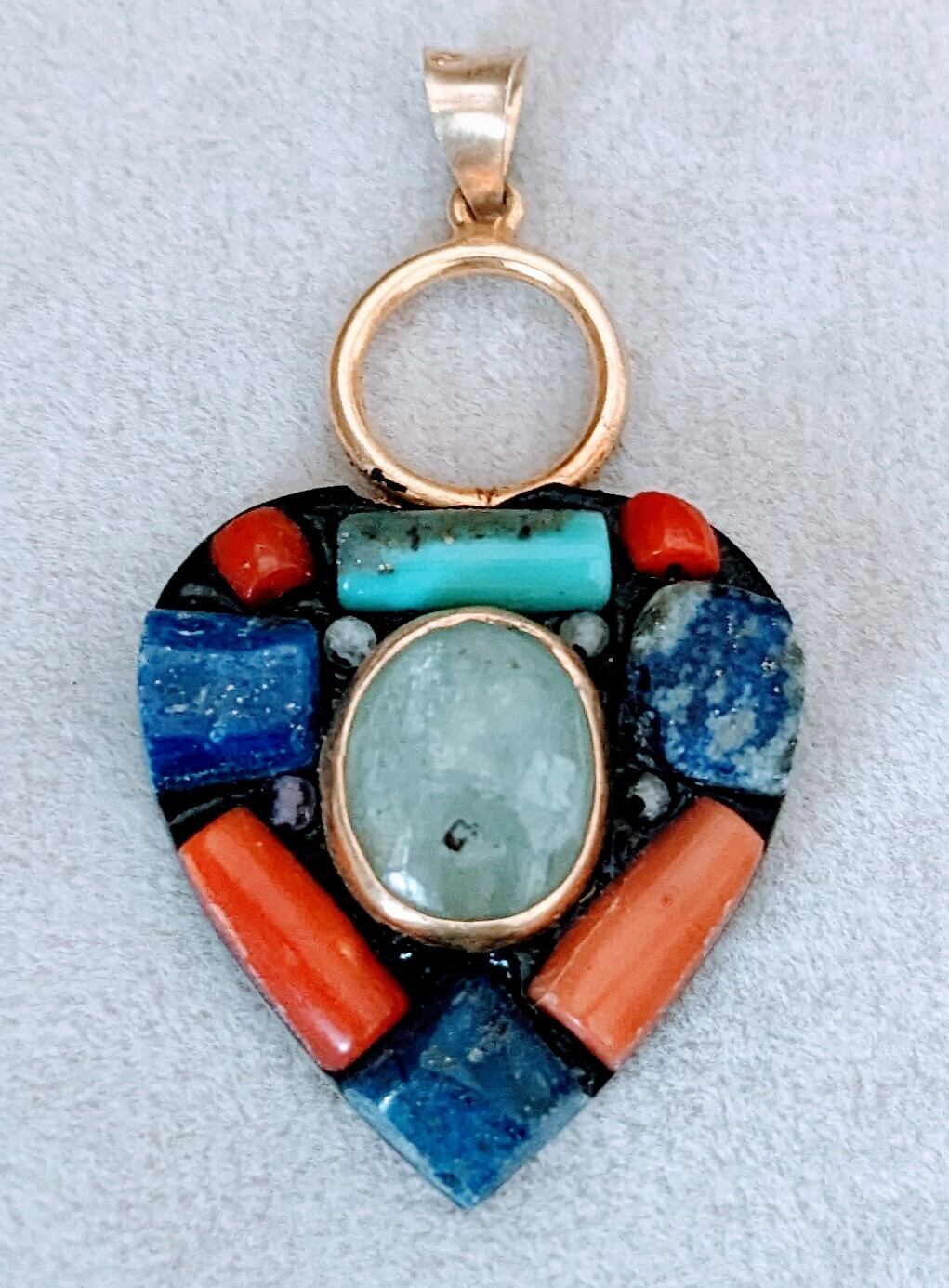 925シルバーにゴールドコーティングを施したハート型のベースにラピスラズリ、赤珊瑚、ターコイズ、真ん中にはカイヤナイトを配置した個性的な色づかいのペンダントトップです。